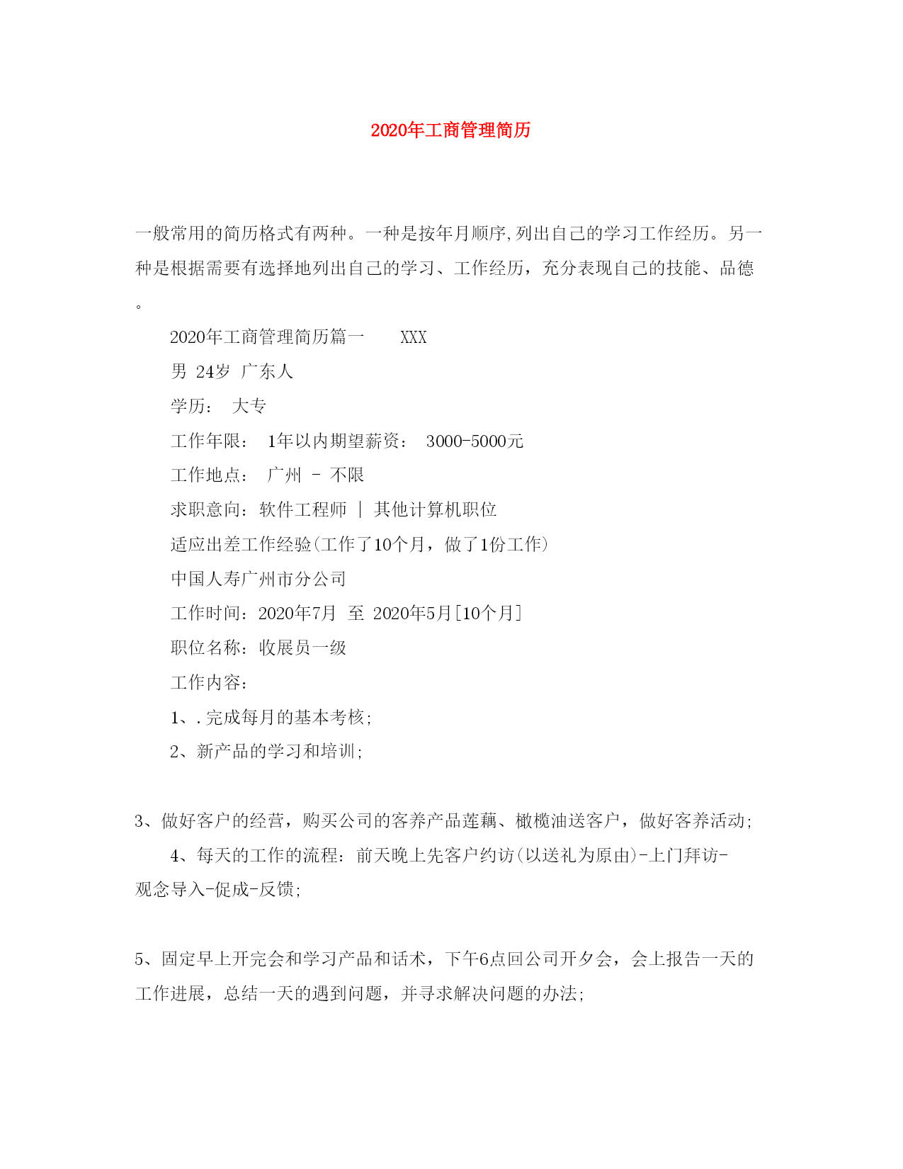 此资料由网络收集而来,如有侵权请告知上传者立即删除。资料共分享,我们负责传递知识。2020年工商管理简历一般常用的简历格式有两种。一种是按年月顺序,列出自己的学习工作经历。另一种是根据需要有选择地列出自己的学习、工作经历,充分表现自己的技能、品德。2020年工商管理简历篇一XXX男24岁广东人学历:大专工作年限:1年以内期望薪资:3000-5000元工作地点:广州-不限求职意向:软件工程师|其他计算机职位适应出差工作经验(工作了10个月,做了1份工作)中国人寿广州市分公司工作时间:2020年7月至2020