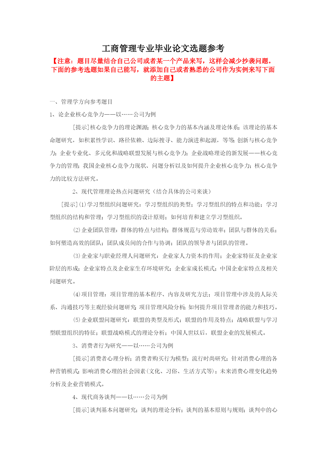 工商管理专业毕业论文选题参考【注意:题目尽量结合自己公司或者某一个产品来写,这样会减少抄袭问题。下面的参考选题如果自己能写,就添加自己或者熟悉的公司作为实例来写下面的主题】一、管理学方向参考题目1、论企业核心竞争力——以……公司为例[提示]核心竞争力的理论渊源;核心竞争力的基本内涵及理论体系;该理论的基本命题研究,如积累性学识、路径依赖、边际搜寻、能力演进和起源,等等;创新与核心竞争力;企业专业化、多元化和战略联盟发展与核心竞争力;企业战略理论的新发展——核心竞争力的管理;我国企业核心竞争力现状、问题分析