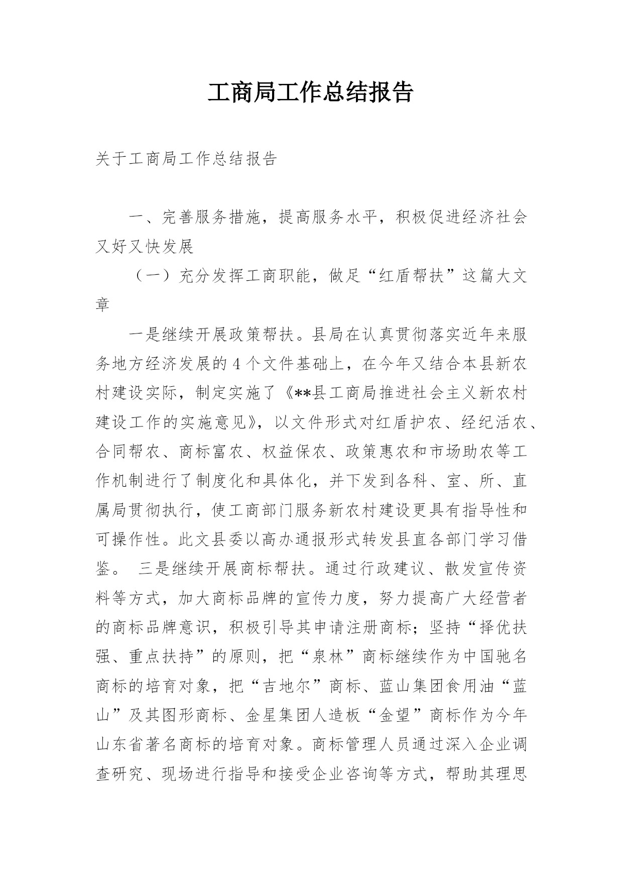 工商局工作总结报告关于工商局工作总结报告一、完善服务措施,提高服务水平,积极促进经济社会又好又快发展(一)充分发挥工商职能,做足“红盾帮扶”这篇大文章一是继续开展政策帮扶。县局在认真贯彻落实近年来服务地方经济发展的4个文件基础上,在今年又结合本县新农村建设实际,制定实施了《**县工商局推进社会主义新农村建设工作的实施意见》,以文件形式对红盾护农、经纪活农、合同帮农、商标富农、权益保农、政策惠农和市场助农等工作机制进行了制度化和具体化,并下发到各科、室、所、直属局贯彻执行,使工商部门服务新农村建设更具有指导