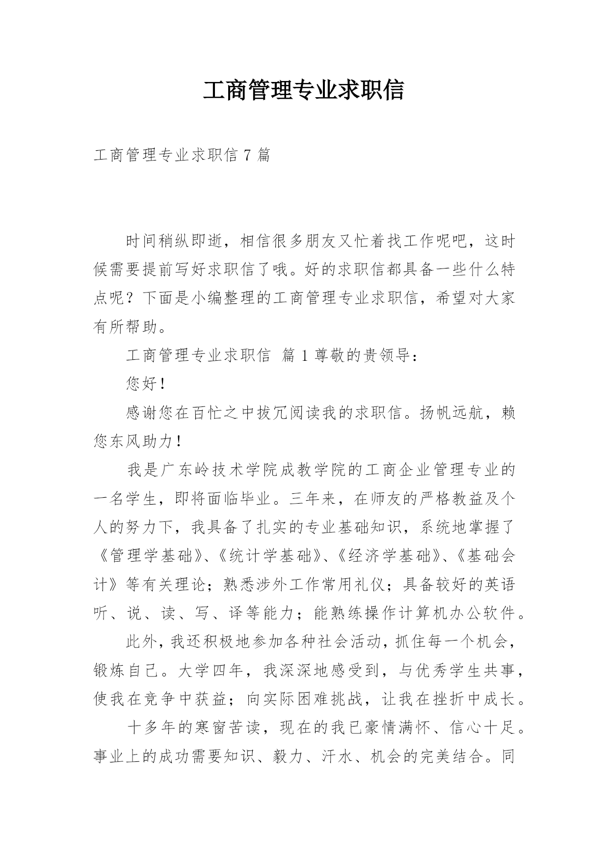 工商管理专业求职信工商管理专业求职信7篇时间稍纵即逝,相信很多朋友又忙着找工作呢吧,这时候需要提前写好求职信了哦。好的求职信都具备一些什么特点呢?下面是小编整理的工商管理专业求职信,希望对大家有所帮助。工商管理专业求职信篇1尊敬的贵领导:您好!感谢您在百忙之中拔冗阅读我的求职信。扬帆远航,赖您东风助力!我是广东岭技术学院成教学院的工商企业管理专业的一名学生,即将面临毕业。三年来,在师友的严格教益及个人的努力下,我具备了扎实的专业基础知识,系统地掌握了《管理学基础》、《统计学基础》、《经济学基础》、《基础会