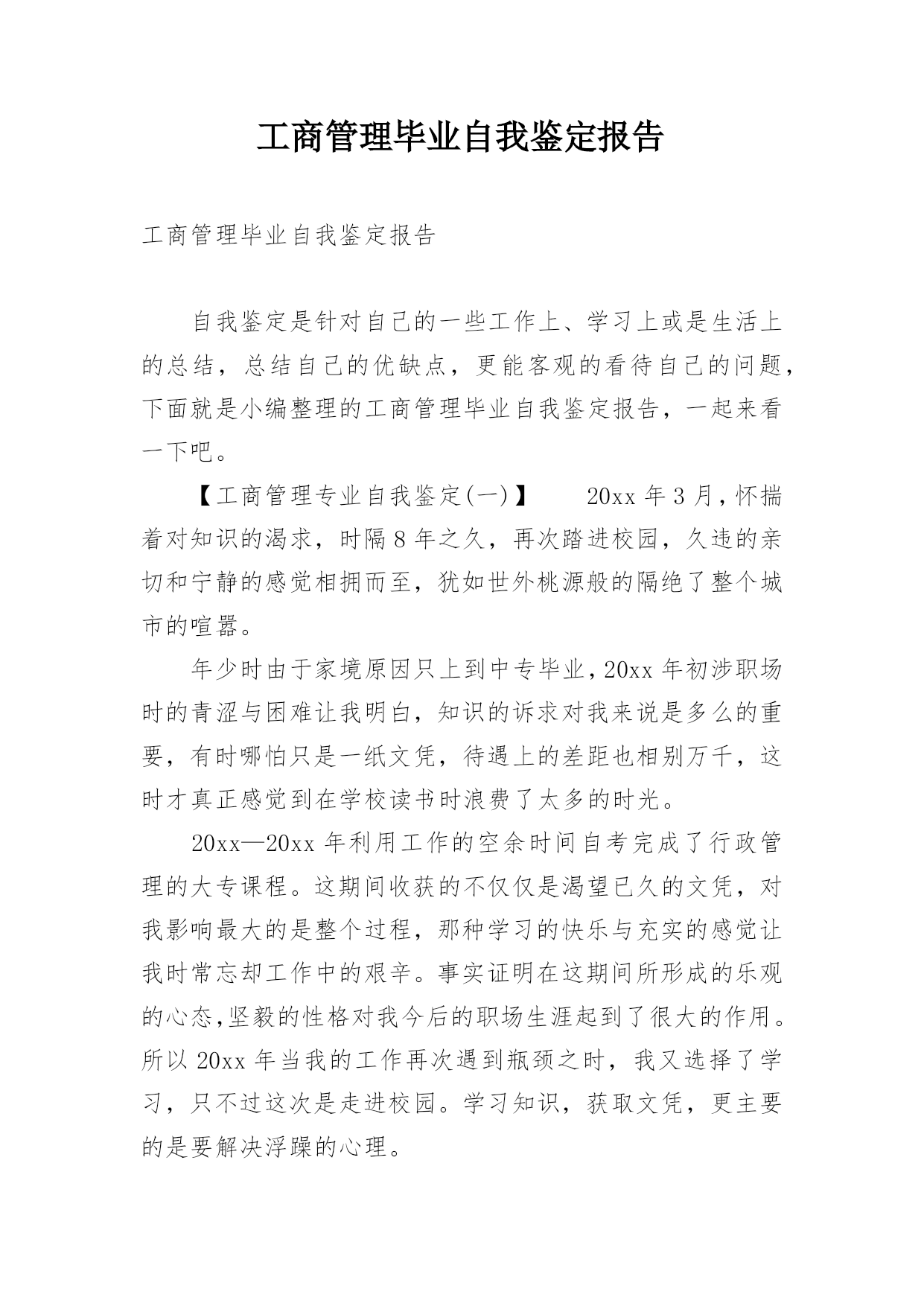 工商管理毕业自我鉴定报告工商管理毕业自我鉴定报告自我鉴定是针对自己的一些工作上、学习上或是生活上的总结,总结自己的优缺点,更能客观的看待自己的问题,下面就是小编整理的工商管理毕业自我鉴定报告,一起来看一下吧。【工商管理专业自我鉴定(一)】20xx年3月,怀揣着对知识的渴求,时隔8年之久,再次踏进校园,久违的亲切和宁静的感觉相拥而至,犹如世外桃源般的隔绝了整个城市的喧嚣。年少时由于家境原因只上到中专毕业,20xx年初涉职场时的青涩与困难让我明白,知识的诉求对我来说是多么的重要,有时哪怕只是一纸文凭,待遇上的