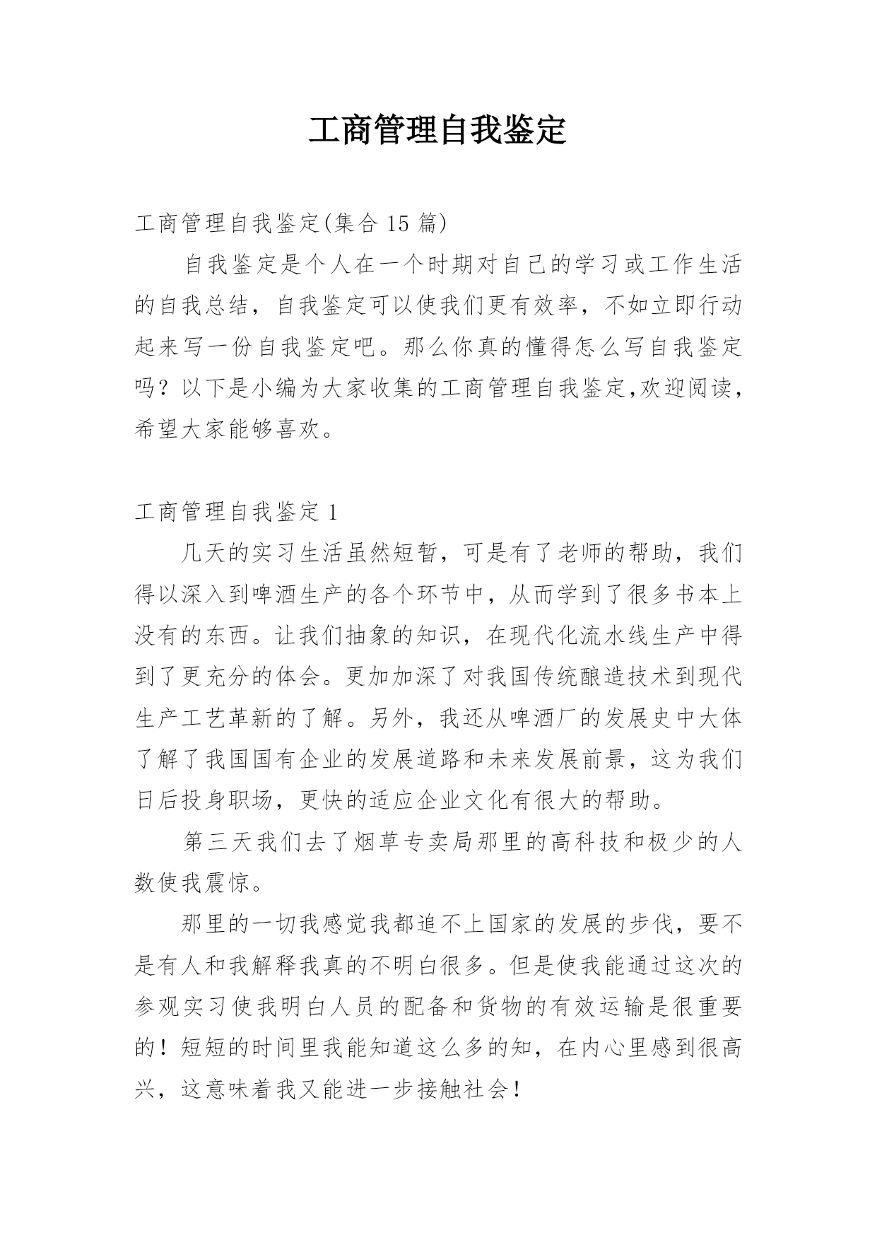 工商管理自我鉴定工商管理自我鉴定(集合15篇)自我鉴定是个人在一个时期对自己的学习或工作生活的自我总结,自我鉴定可以使我们更有效率,不如立即行动起来写一份自我鉴定吧。那么你真的懂得怎么写自我鉴定吗?以下是小编为大家收集的工商管理自我鉴定,欢迎阅读,希望大家能够喜欢。工商管理自我鉴定1几天的实习生活虽然短暂,可是有了老师的帮助,我们得以深入到啤酒生产的各个环节中,从而学到了很多书本上没有的东西。让我们抽象的知识,在现代化流水线生产中得到了更充分的体会。更加加深了对我国传统酿造技术到现代生产工艺革新的了解。另
