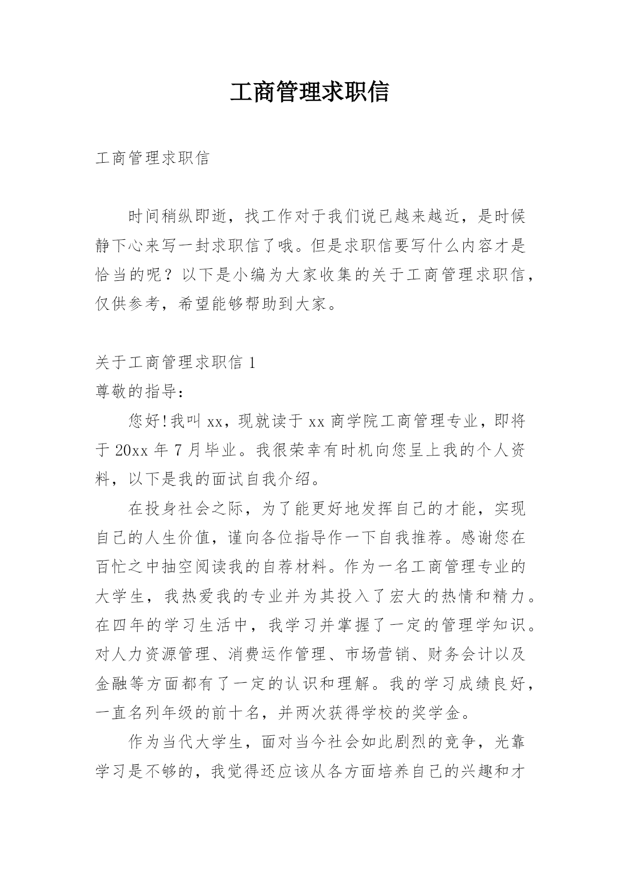 工商管理求职信工商管理求职信时间稍纵即逝,找工作对于我们说已越来越近,是时候静下心来写一封求职信了哦。但是求职信要写什么内容才是恰当的呢?以下是小编为大家收集的关于工商管理求职信,仅供参考,希望能够帮助到大家。关于工商管理求职信1尊敬的指导:您好!我叫xx,现就读于xx商学院工商管理专业,即将于20xx年7月毕业。我很荣幸有时机向您呈上我的个人资料,以下是我的面试自我介绍。在投身社会之际,为了能更好地发挥自己的才能,实现自己的人生价值,谨向各位指导作一下自我推荐。感谢您在百忙之中抽空阅读我的自荐材料。作为