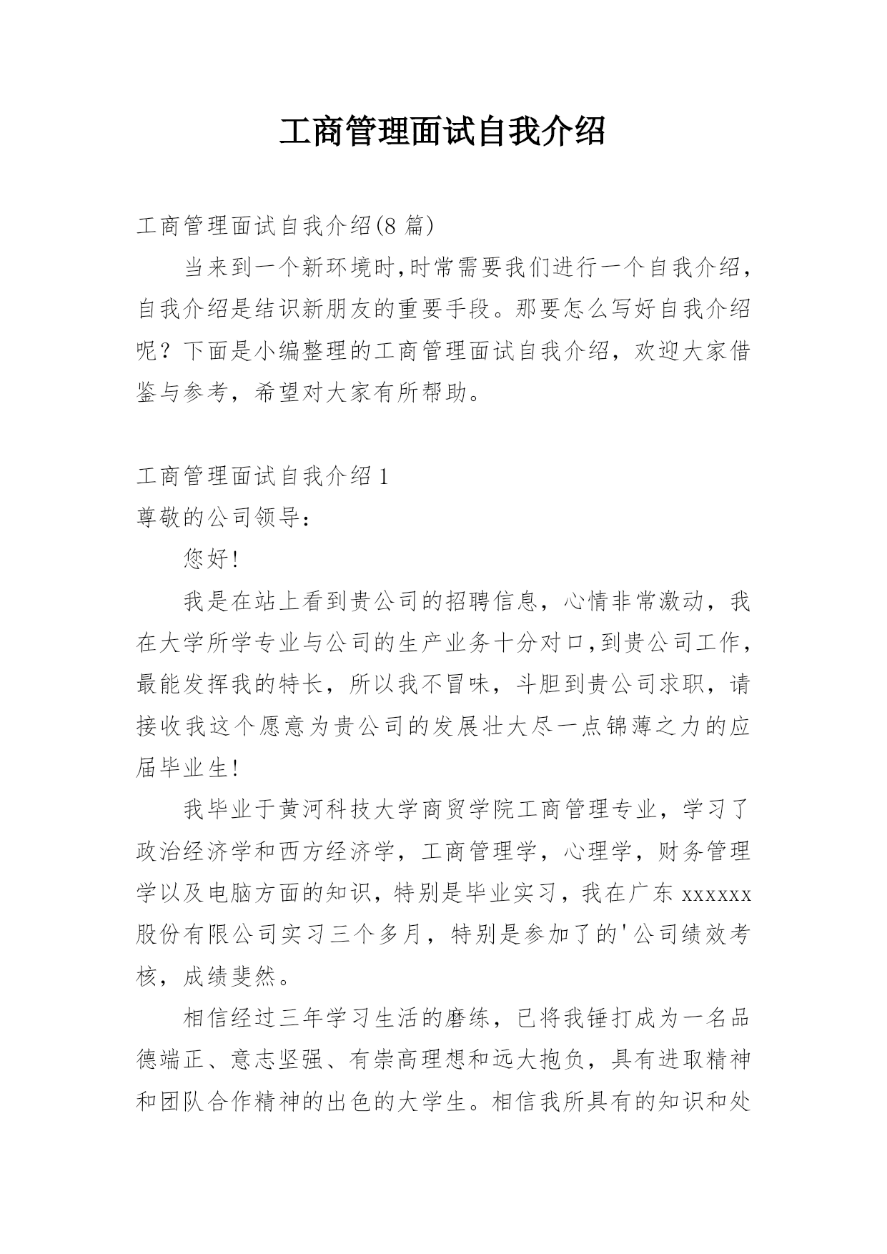 工商管理面试自我介绍工商管理面试自我介绍(8篇)当来到一个新环境时,时常需要我们进行一个自我介绍,自我介绍是结识新朋友的重要手段。那要怎么写好自我介绍呢?下面是小编整理的工商管理面试自我介绍,欢迎大家借鉴与参考,希望对大家有所帮助。工商管理面试自我介绍1尊敬的公司领导:您好!我是在站上看到贵公司的招聘信息,心情非常激动,我在大学所学专业与公司的生产业务十分对口,到贵公司工作,最能发挥我的特长,所以我不冒味,斗胆到贵公司求职,请接收我这个愿意为贵公司的发展壮大尽一点锦薄之力的应届毕业生!我毕业于黄河科技大学
