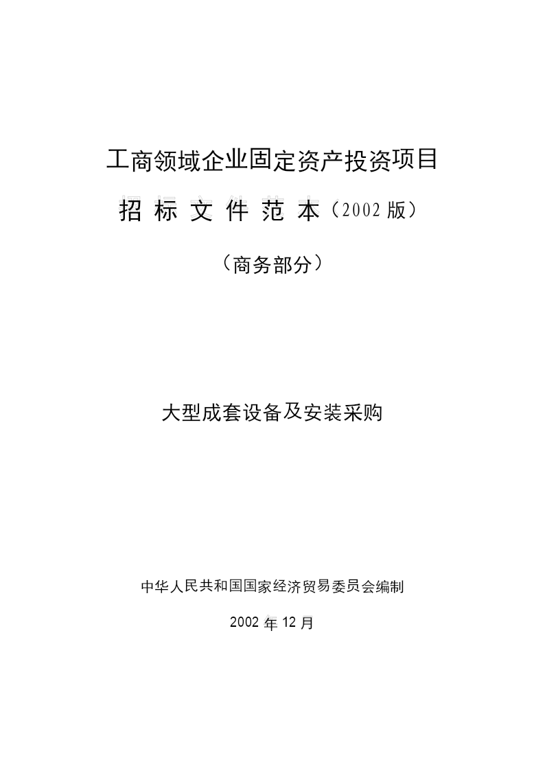 工商领域企业固定资产投资项目招标文件范本(2002版)(商务部分)大型成套设备及安装采购中华人民共和国国家经济贸易委员会编制2002年12月工商领域企业固定资产投资项目招标文件范本2002版前言依据《中华人民共和国招标投标法》及《工商领域企业固定资产投资项目招标投标管理办法》(国家经贸委令第39号)等有关招投标的规定编制本文件。本文件适用于国家经贸委令第39号规定的工商领域企业固定资产投资项目的招标投标活动。招标代理机构和自行招标项目单位应按照项目要求参照本文件编制招标文件。本文件原则上不得修改,其中的“