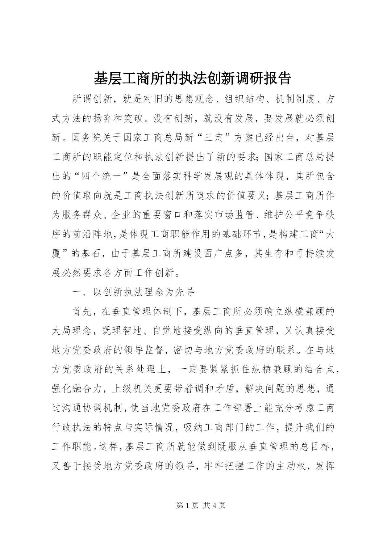 第PAGE\*Arabic\*MERGEFORMAT4页共NUMPAGES\*MERGEFORMAT4页基层工商所的执法创新调研报告所谓创新,就是对旧的思想观念、组织结构、机制制度、方式方法的扬弃和突破。没有创新,就没有发展,要发展就必须创新。国务院关于国家工商总局新“三定”方案已经出台,对基层工商所的职能定位和执法创新提出了新的要求;国家工商总局提出的“四个统一”是全面落实科学发展观的具体体现,其所包含的价值取向就是工商执法创新所追求的价值要义;基层工商所作为服务群众、企业的重要窗口和落实市