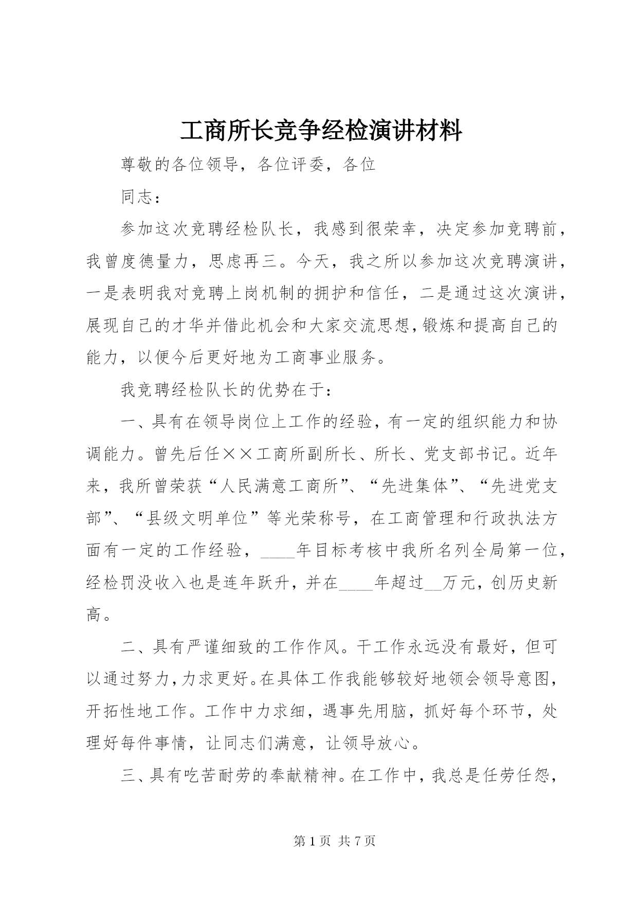 第PAGE\*Arabic\*MERGEFORMAT7页共NUMPAGES\*MERGEFORMAT7页工商所长竞争经检演讲材料尊敬的各位领导,各位评委,各位同志:参加这次竞聘经检队长,我感到很荣幸,决定参加竞聘前,我曾度德量力,思虑再三。今天,我之所以参加这次竞聘演讲,一是表明我对竞聘上岗机制的拥护和信任,二是通过这次演讲,展现自己的才华并借此机会和大家交流思想,锻炼和提高自己的能力,以便今后更好地为工商事业服务。我竞聘经检队长的优势在于:一、具有在领导岗位上工作的经验,有一定的组织能力和协