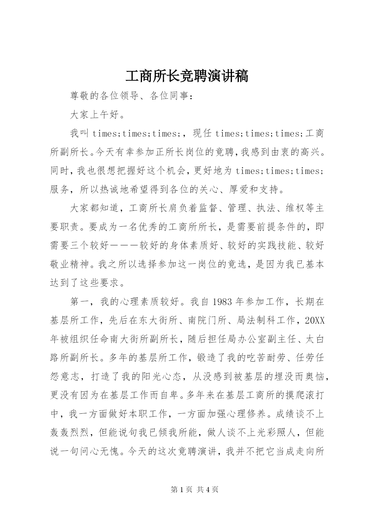 第PAGE\*Arabic\*MERGEFORMAT4页共NUMPAGES\*MERGEFORMAT4页工商所长竞聘演讲稿尊敬的各位领导、各位同事:大家上午好。我叫times;times;times;,现任times;times;times;工商所副所长。今天有幸参加正所长岗位的竟聘,我感到由衷的高兴。同时,我也很想把握好这个机会,更好地为times;times;times;服务,所以热诚地希望得到各位的关心、厚爱和支持。大家都知道,工商所长肩负着监督、管理、执法、维权等主要职责。要成为一名优
