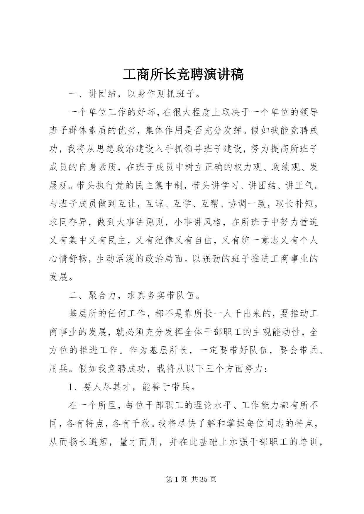 第PAGE\*Arabic\*MERGEFORMAT35页共NUMPAGES\*MERGEFORMAT35页工商所长竞聘演讲稿一、讲团结,以身作则抓班子。一个单位工作的好坏,在很大程度上取决于一个单位的领导班子群体素质的优劣,集体作用是否充分发挥。假如我能竞聘成功,我将从思想政治建设入手抓领导班子建设,努力提高所班子成员的自身素质,在班子成员中树立正确的权力观、政绩观、发展观。带头执行党的民主集中制,带头讲学习、讲团结、讲正气。与班子成员做到互让,互谅、互学、互帮、协调一致,取长补短,求同存异