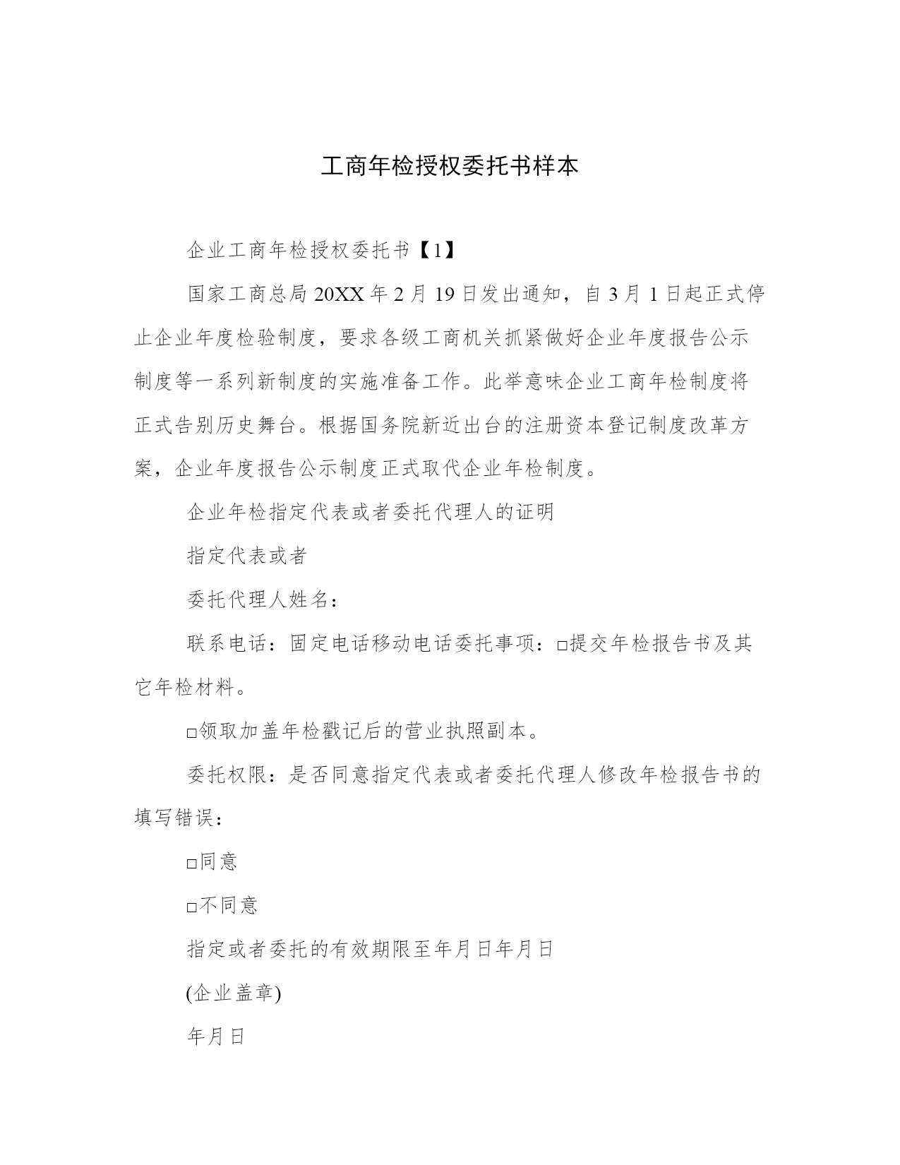工商年检授权委托书样本企业工商年检授权委托书【1】国家工商总局20XX年2月19日发出通知,自3月1日起正式停止企业年度检验制度,要求各级工商机关抓紧做好企业年度报告公示制度等一系列新制度的实施准备工作。此举意味企业工商年检制度将正式告别历史舞台。根据国务院新近出台的注册资本登记制度改革方案,企业年度报告公示制度正式取代企业年检制度。企业年检指定代表或者委托代理人的证明指定代表或者委托代理人姓名:联系电话:固定电话移动电话委托事项:□提交年检报告书及其它年检材料。□领取加盖年检戳记后的营业执照副本。委托权