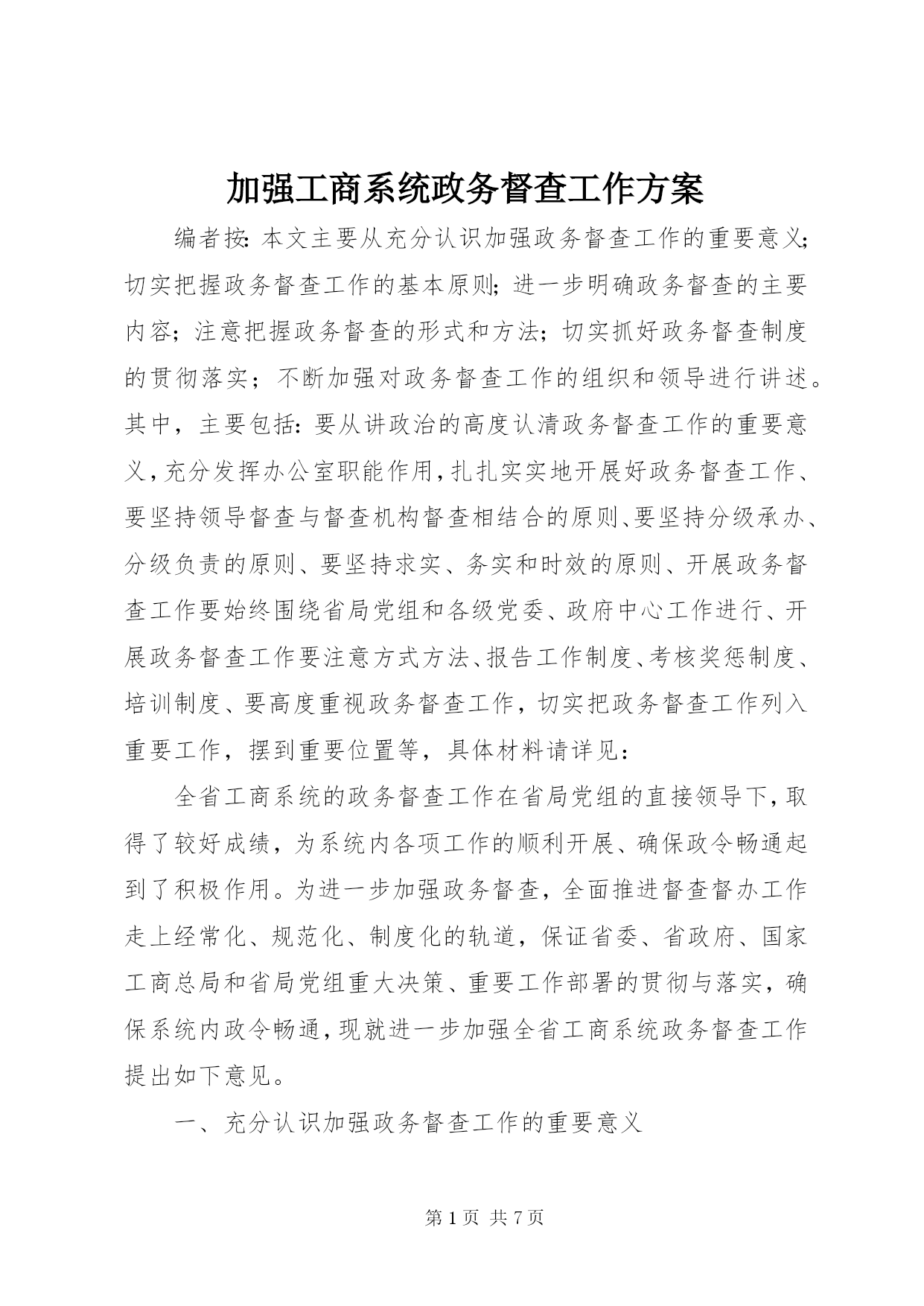 第PAGE\*Arabic\*MERGEFORMAT7页共NUMPAGES\*MERGEFORMAT7页加强工商系统政务督查工作方案编者按:本文主要从充分认识加强政务督查工作的重要意义;切实把握政务督查工作的基本原则;进一步明确政务督查的主要内容;注意把握政务督查的形式和方法;切实抓好政务督查制度的贯彻落实;不断加强对政务督查工作的组织和领导进行讲述。其中,主要包括:要从讲政治的高度认清政务督查工作的重要意义,充分发挥办公室职能作用,扎扎实实地开展好政务督查工作、要坚持领导督查与督查机构督查相