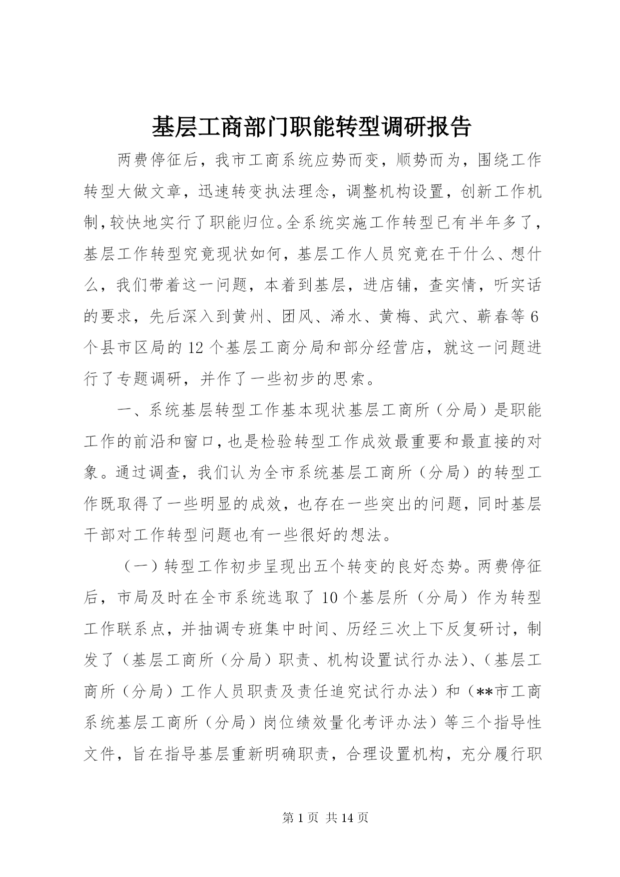第PAGE\*Arabic\*MERGEFORMAT14页共NUMPAGES\*MERGEFORMAT14页基层工商部门职能转型调研报告两费停征后,我市工商系统应势而变,顺势而为,围绕工作转型大做文章,迅速转变执法理念,调整机构设置,创新工作机制,较快地实行了职能归位。全系统实施工作转型已有半年多了,基层工作转型究竟现状如何,基层工作人员究竟在干什么、想什么,我们带着这一问题,本着到基层,进店铺,查实情,听实话的要求,先后深入到黄州、团风、浠水、黄梅、武穴、蕲春等6个县市区局的12个基层工商分