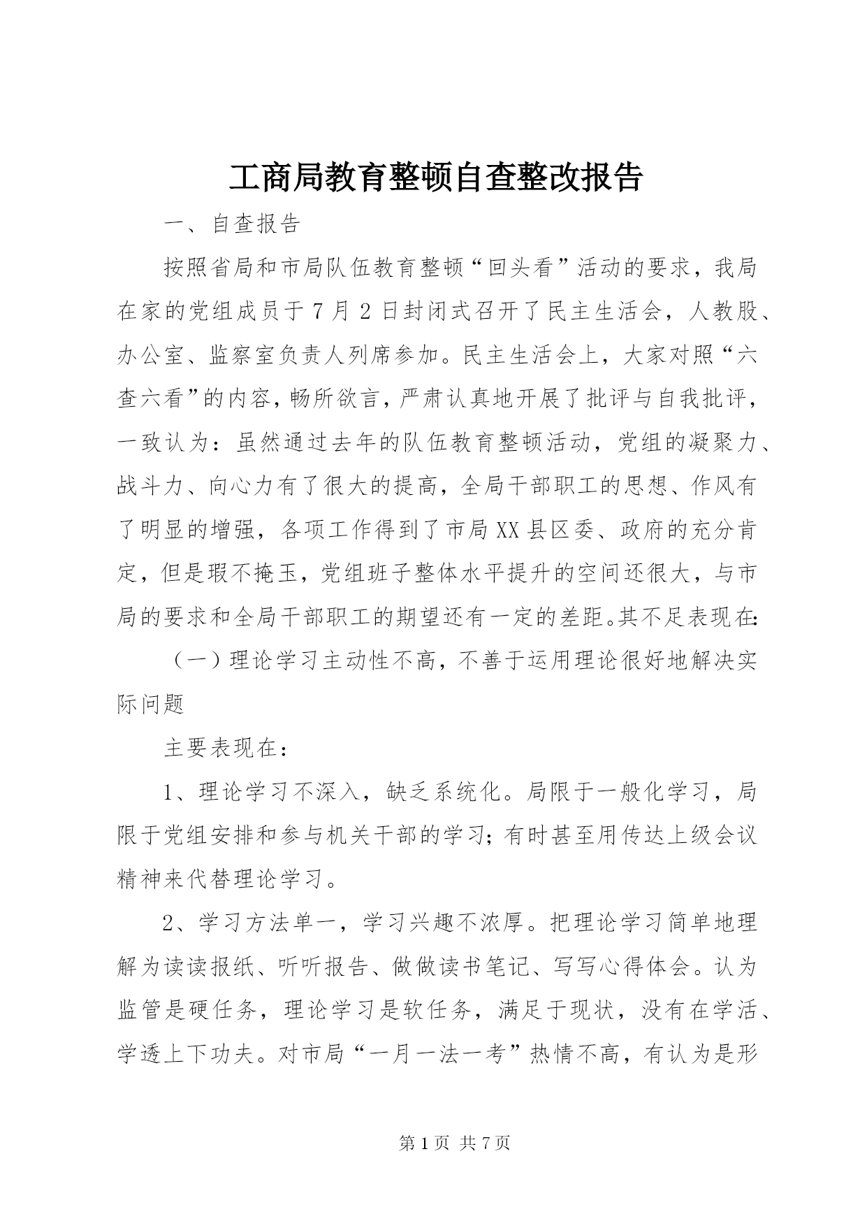 第PAGE\*Arabic\*MERGEFORMAT7页共NUMPAGES\*MERGEFORMAT7页工商局教育整顿自查整改报告一、自查报告按照省局和市局队伍教育整顿“回头看”活动的要求,我局在家的党组成员于7月2日封闭式召开了民主生活会,人教股、办公室、监察室负责人列席参加。民主生活会上,大家对照“六查六看”的内容,畅所欲言,严肃认真地开展了批评与自我批评,一致认为:虽然通过去年的队伍教育整顿活动,党组的凝聚力、战斗力、向心力有了很大的提高,全局干部职工的思想、作风有了明显的增强,各项工作