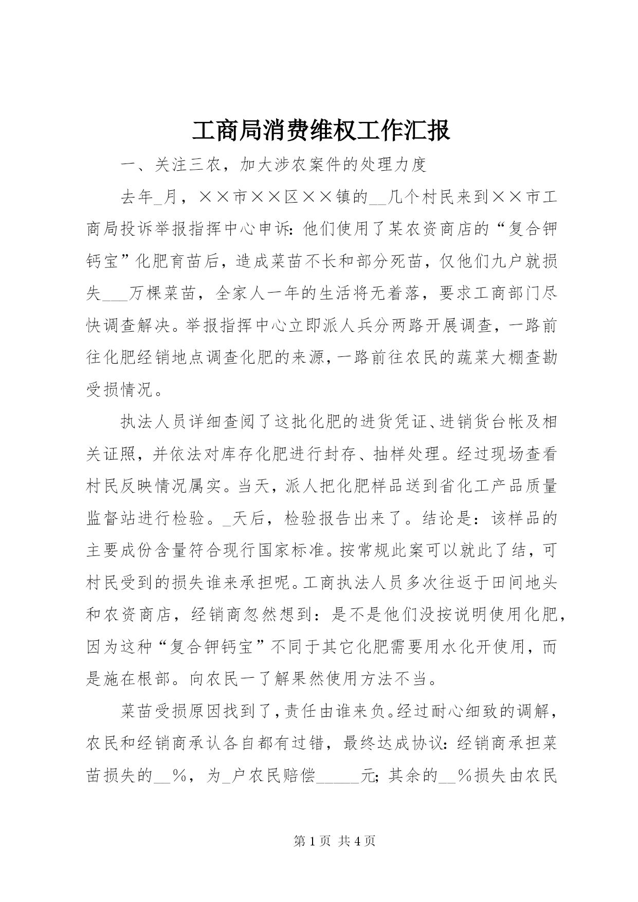 第PAGE\*Arabic\*MERGEFORMAT4页共NUMPAGES\*MERGEFORMAT4页工商局消费维权工作汇报一、关注三农,加大涉农案件的处理力度去年_月,××市××区××镇的__几个村民来到××市工商局投诉举报指挥中心申诉:他们使用了某农资商店的“复合钾钙宝”化肥育苗后,造成菜苗不长和部分死苗,仅他们九户就损失___万棵菜苗,全家人一年的生活将无着落,要求工商部门尽快调查解决。举报指挥中心立即派人兵分两路开展调查,一路前往化肥经销地点调查化肥的来源,一路前往农民的蔬菜大棚查勘