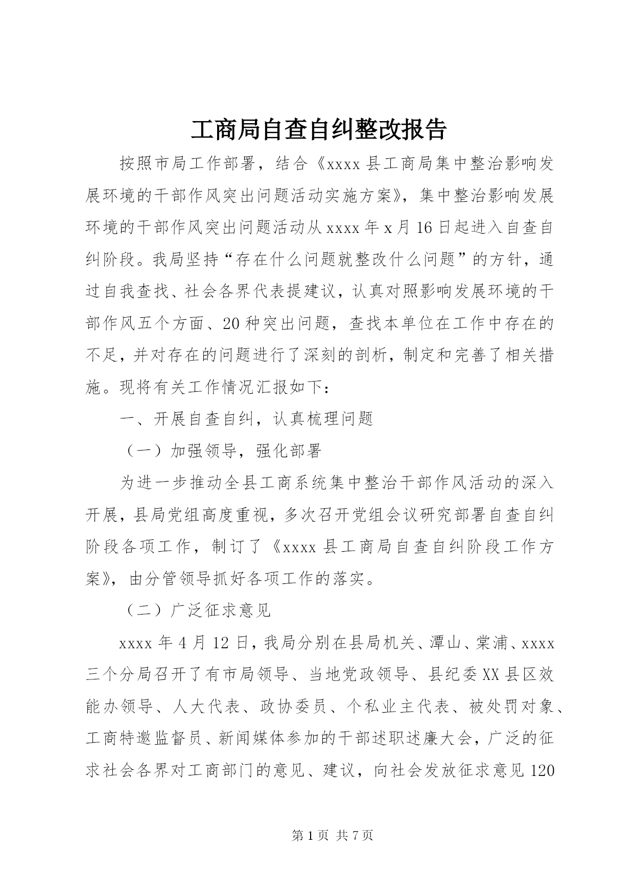 第PAGE\*Arabic\*MERGEFORMAT7页共NUMPAGES\*MERGEFORMAT7页工商局自查自纠整改报告按照市局工作部署,结合《xxxx县工商局集中整治影响发展环境的干部作风突出问题活动实施方案》,集中整治影响发展环境的干部作风突出问题活动从xxxx年x月16日起进入自查自纠阶段。我局坚持“存在什么问题就整改什么问题”的方针,通过自我查找、社会各界代表提建议,认真对照影响发展环境的干部作风五个方面、20种突出问题,查找本单位在工作中存在的不足,并对存在的问题进行了深刻的剖