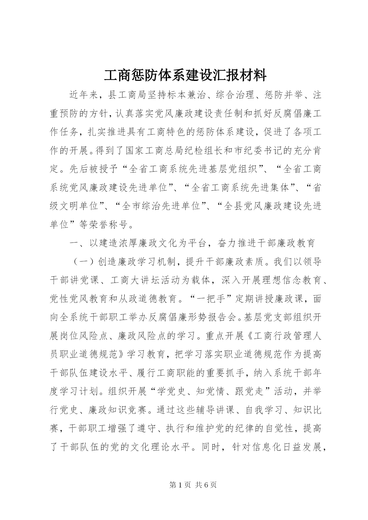第PAGE\*Arabic\*MERGEFORMAT6页共NUMPAGES\*MERGEFORMAT6页工商惩防体系建设汇报材料近年来,县工商局坚持标本兼治、综合治理、惩防并举、注重预防的方针,认真落实党风廉政建设责任制和抓好反腐倡廉工作任务,扎实推进具有工商特色的惩防体系建设,促进了各项工作的开展。得到了国家工商总局纪检组长和市纪委书记的充分肯定。先后被授予“全省工商系统先进基层党组织”、“全省工商系统党风廉政建设先进单位”、“全省工商系统先进集体”、“省级文明单位”、“全市综治先进单位”、