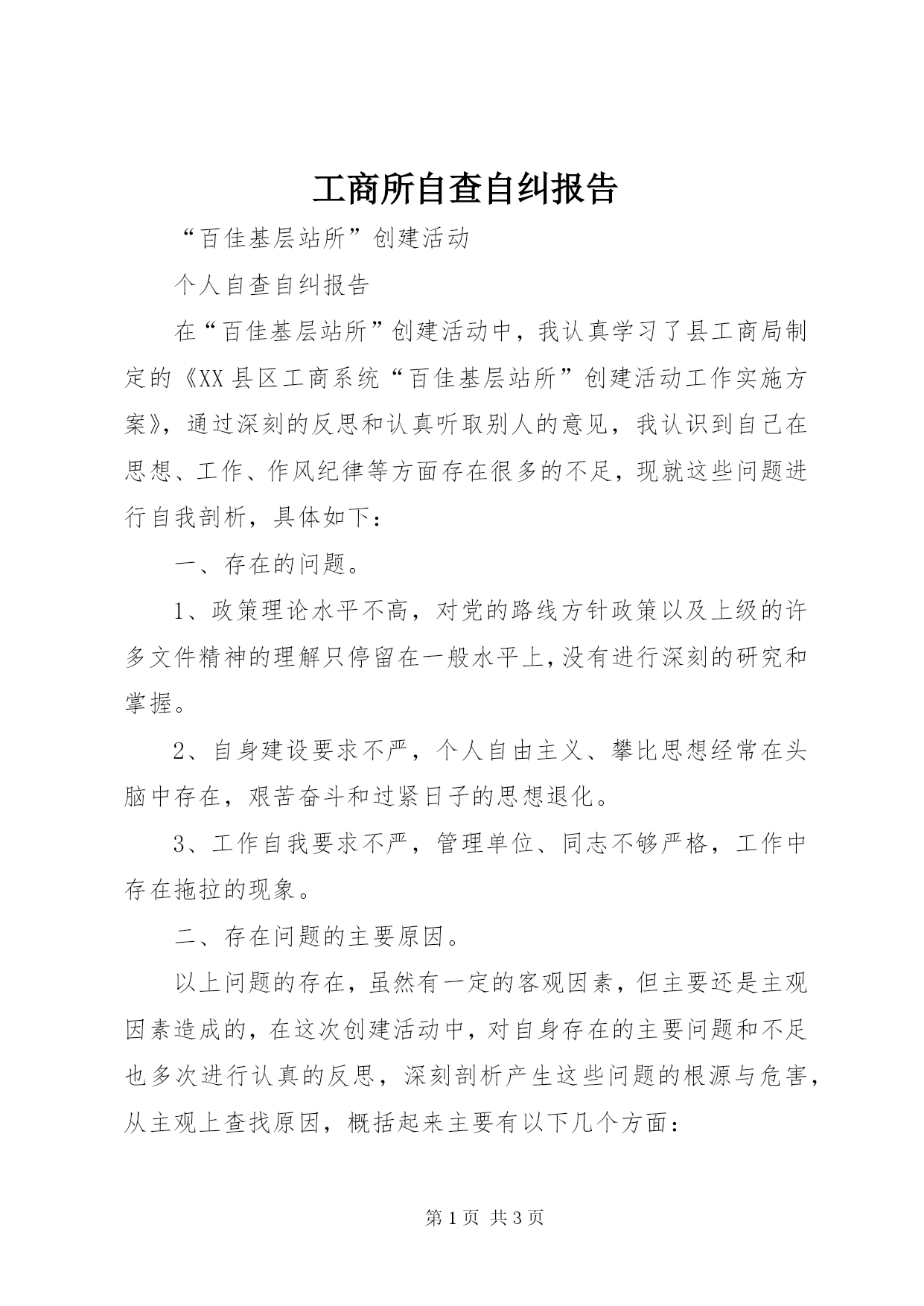 第PAGE\*Arabic\*MERGEFORMAT3页共NUMPAGES\*MERGEFORMAT3页工商所自查自纠报告“百佳基层站所”创建活动个人自查自纠报告在“百佳基层站所”创建活动中,我认真学习了县工商局制定的《XX县区工商系统“百佳基层站所”创建活动工作实施方案》,通过深刻的反思和认真听取别人的意见,我认识到自己在思想、工作、作风纪律等方面存在很多的不足,现就这些问题进行自我剖析,具体如下:一、存在的问题。1、政策理论水平不高,对党的路线方针政策以及上级的许多文件精神的理解只停留在一