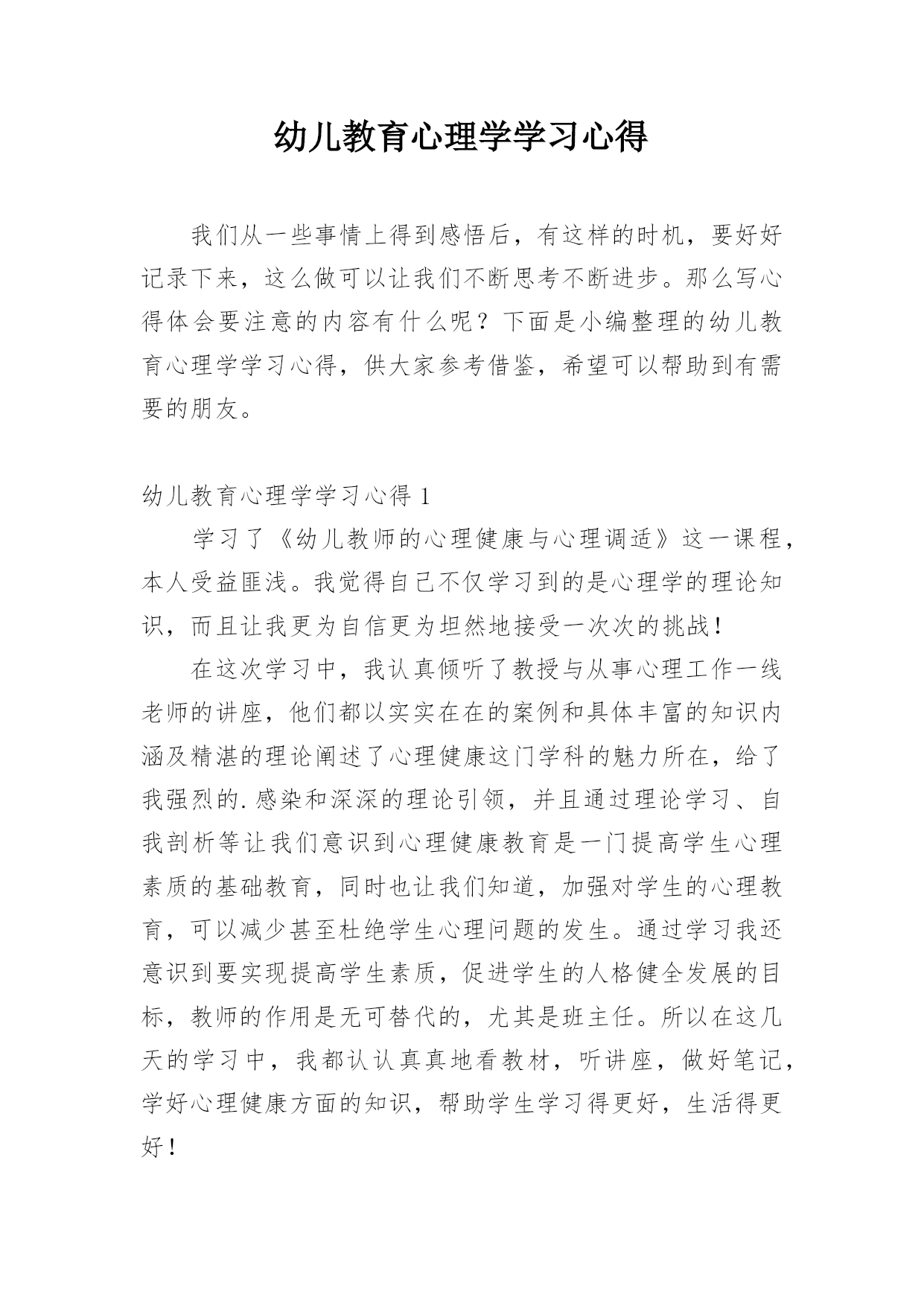 幼儿教育心理学学习心得我们从一些事情上得到感悟后,有这样的时机,要好好记录下来,这么做可以让我们不断思考不断进步。那么写心得体会要注意的内容有什么呢?下面是小编整理的幼儿教育心理学学习心得,供大家参考借鉴,希望可以帮助到有需要的朋友。幼儿教育心理学学习心得1学习了《幼儿教师的心理健康与心理调适》这一课程,本人受益匪浅。我觉得自己不仅学习到的是心理学的理论知识,而且让我更为自信更为坦然地接受一次次的挑战!在这次学习中,我认真倾听了教授与从事心理工作一线老师的讲座,他们都以实实在在的案例和具体丰富的知识内涵及