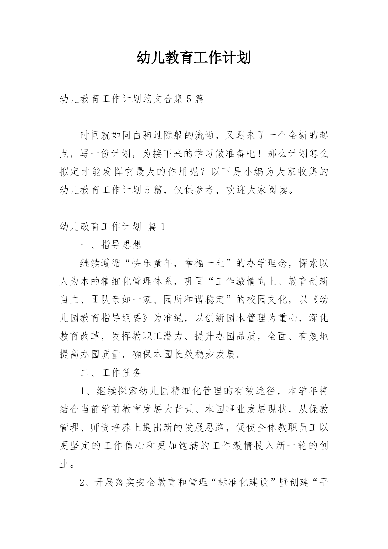 幼儿教育工作计划幼儿教育工作计划范文合集5篇时间就如同白驹过隙般的流逝,又迎来了一个全新的起点,写一份计划,为接下来的学习做准备吧!那么计划怎么拟定才能发挥它最大的作用呢?以下是小编为大家收集的幼儿教育工作计划5篇,仅供参考,欢迎大家阅读。幼儿教育工作计划篇1一、指导思想继续遵循“快乐童年,幸福一生”的办学理念,探索以人为本的精细化管理体系,巩固“工作激情向上、教育创新自主、团队亲如一家、园所和谐稳定”的校园文化,以《幼儿园教育指导纲要》为准绳,以创新园本管理为重心,深化教育改革,发挥教职工潜力、提升办园