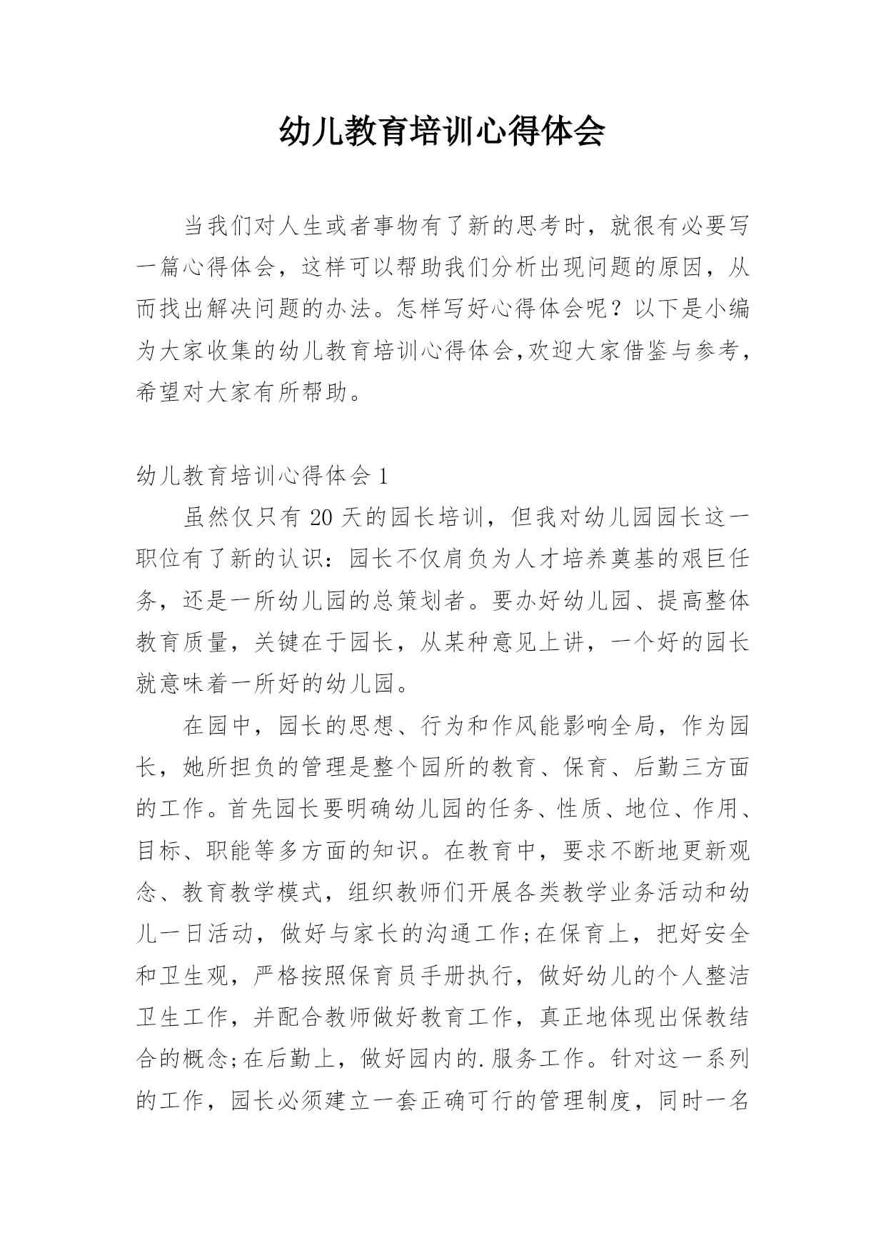 幼儿教育培训心得体会当我们对人生或者事物有了新的思考时,就很有必要写一篇心得体会,这样可以帮助我们分析出现问题的原因,从而找出解决问题的办法。怎样写好心得体会呢?以下是小编为大家收集的幼儿教育培训心得体会,欢迎大家借鉴与参考,希望对大家有所帮助。幼儿教育培训心得体会1虽然仅只有20天的园长培训,但我对幼儿园园长这一职位有了新的认识:园长不仅肩负为人才培养奠基的艰巨任务,还是一所幼儿园的总策划者。要办好幼儿园、提高整体教育质量,关键在于园长,从某种意见上讲,一个好的园长就意味着一所好的幼儿园。在园中,园长的
