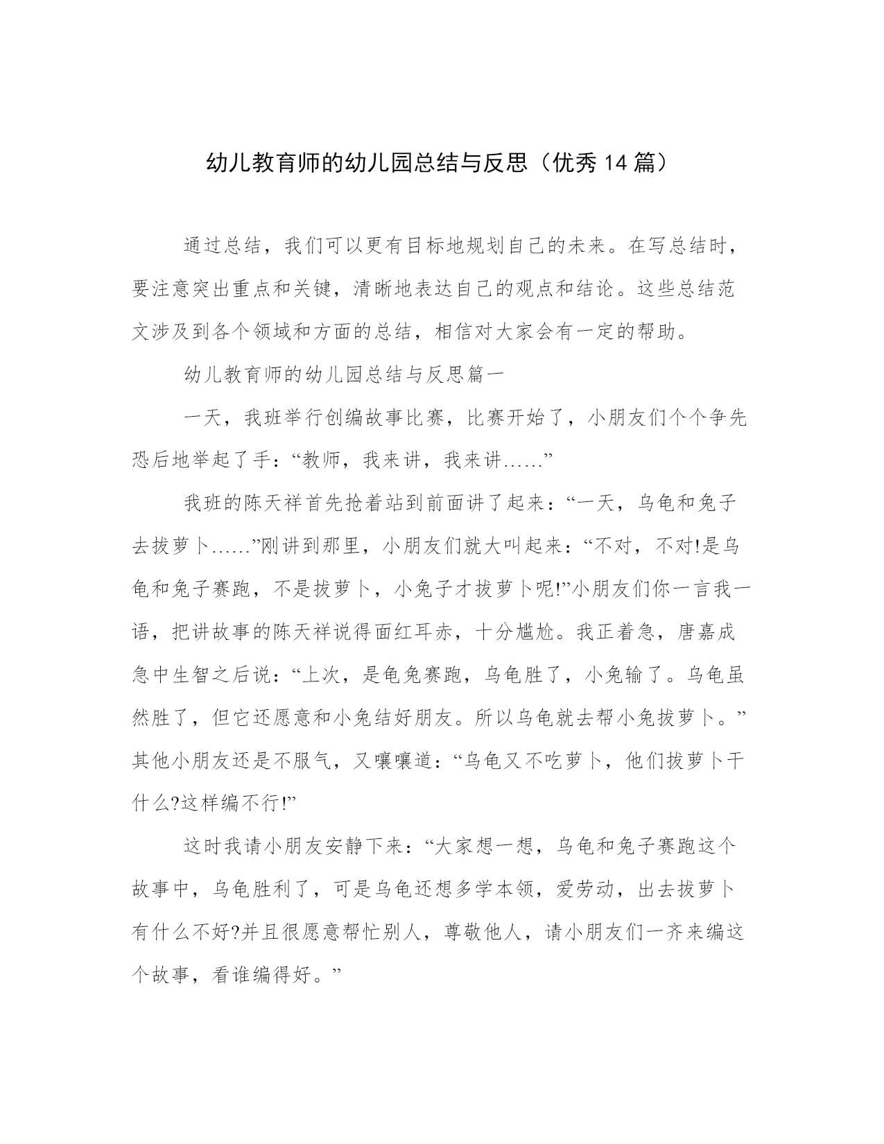 幼儿教育师的幼儿园总结与反思(优秀14篇)通过总结,我们可以更有目标地规划自己的未来。在写总结时,要注意突出重点和关键,清晰地表达自己的观点和结论。这些总结范文涉及到各个领域和方面的总结,相信对大家会有一定的帮助。幼儿教育师的幼儿园总结与反思篇一一天,我班举行创编故事比赛,比赛开始了,小朋友们个个争先恐后地举起了手:“教师,我来讲,我来讲……”我班的陈天祥首先抢着站到前面讲了起来:“一天,乌龟和兔子去拔萝卜……”刚讲到那里,小朋友们就大叫起来:“不对,不对!是乌龟和兔子赛跑,不是拔萝卜,小兔子才拔萝卜呢!