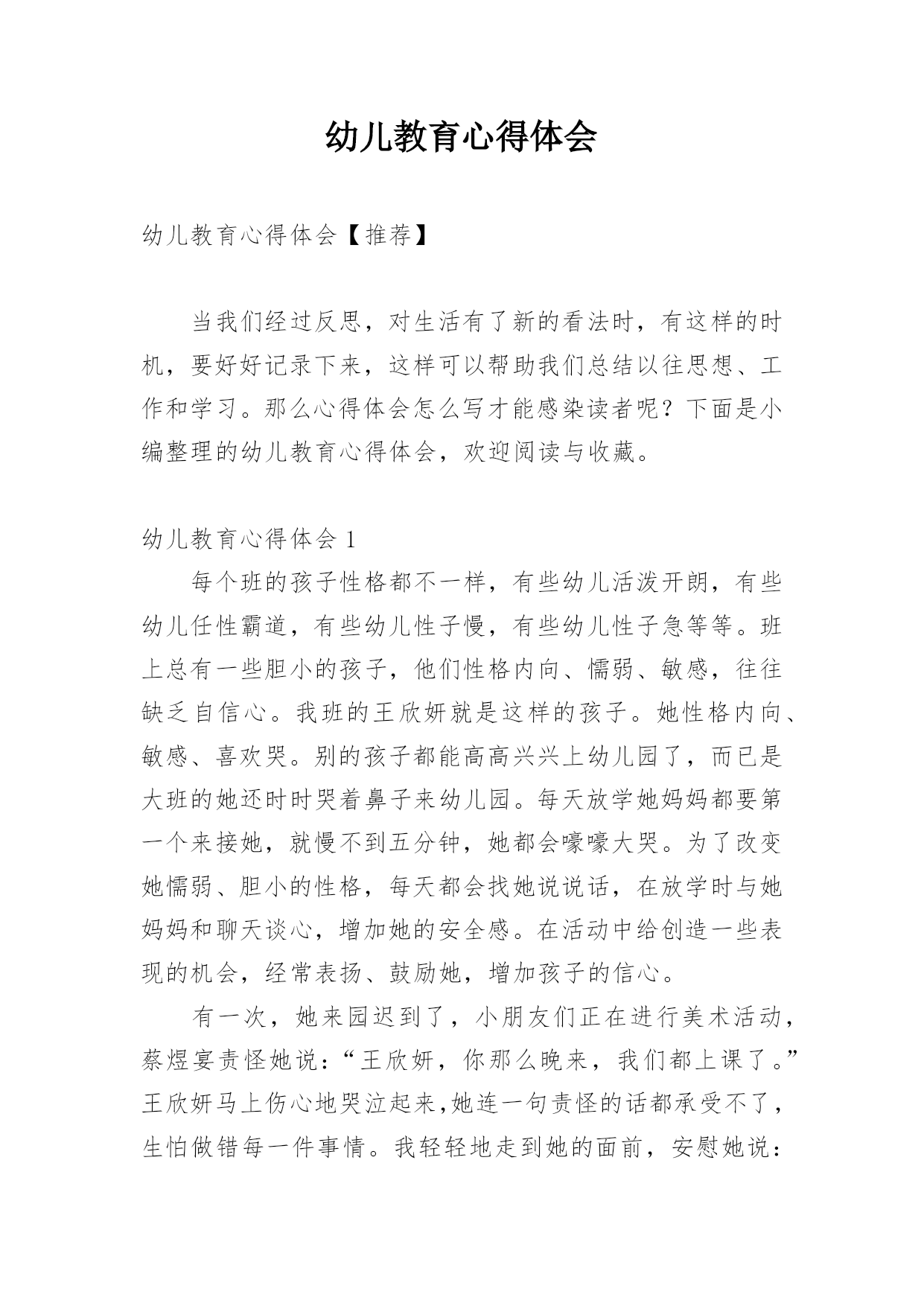 幼儿教育心得体会幼儿教育心得体会【推荐】当我们经过反思,对生活有了新的看法时,有这样的时机,要好好记录下来,这样可以帮助我们总结以往思想、工作和学习。那么心得体会怎么写才能感染读者呢?下面是小编整理的幼儿教育心得体会,欢迎阅读与收藏。幼儿教育心得体会1每个班的孩子性格都不一样,有些幼儿活泼开朗,有些幼儿任性霸道,有些幼儿性子慢,有些幼儿性子急等等。班上总有一些胆小的孩子,他们性格内向、懦弱、敏感,往往缺乏自信心。我班的王欣妍就是这样的孩子。她性格内向、敏感、喜欢哭。别的孩子都能高高兴兴上幼儿园了,而已是大