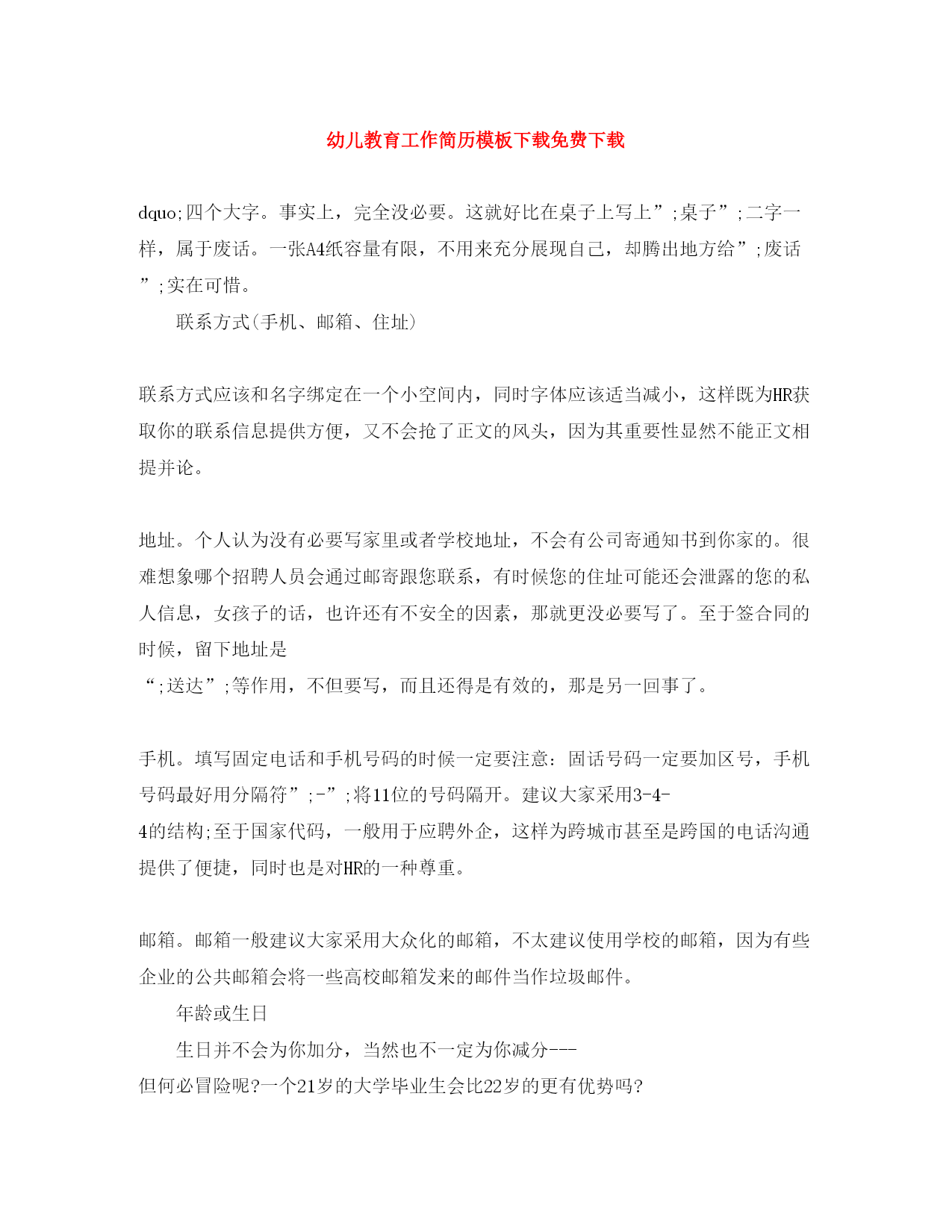 此资料由网络收集而来,如有侵权请告知上传者立即删除。资料共分享,我们负责传递知识。幼儿教育工作简历模板下载免费下载dquo;四个大字。事实上,完全没必要。这就好比在桌子上写上”;桌子”;二字一样,属于废话。一张A4纸容量有限,不用来充分展现自己,却腾出地方给”;废话”;实在可惜。联系方式(手机、邮箱、住址)联系方式应该和名字绑定在一个小空间内,同时字体应该适当减小,这样既为HR获取你的联系信息提供方便,又不会抢了正文的风头,因为其重要性显然不能正文相提并论。地址。个人认为没有必要写家里或者学校地址,不会有