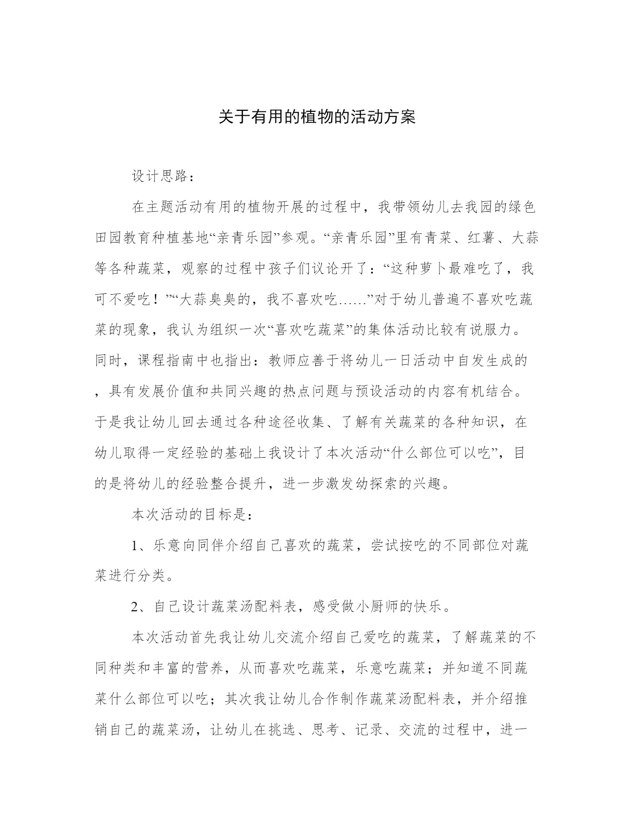 关于有用的植物的活动方案设计思路:在主题活动有用的植物开展的过程中,我带领幼儿去我园的绿色田园教育种植基地“亲青乐园”参观。“亲青乐园”里有青菜、红薯、大蒜等各种蔬菜,观察的过程中孩子们议论开了:“这种萝卜最难吃了,我可不爱吃!”“大蒜臭臭的,我不喜欢吃……”对于幼儿普遍不喜欢吃蔬菜的现象,我认为组织一次“喜欢吃蔬菜”的集体活动比较有说服力。同时,课程指南中也指出:教师应善于将幼儿一日活动中自发生成的,具有发展价值和共同兴趣的热点问题与预设活动的内容有机结合。于是我让幼儿回去通过各种途径收集、了解有关蔬菜