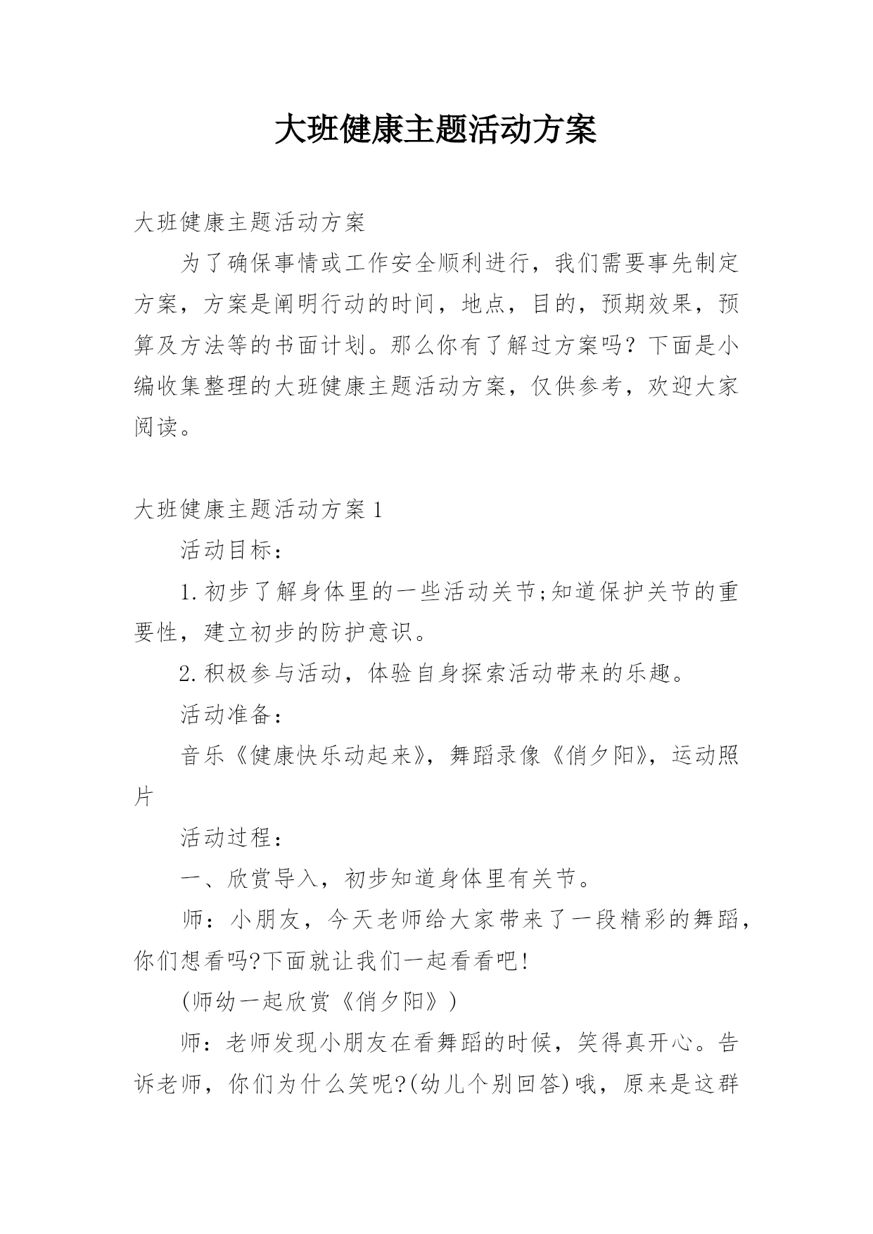 大班健康主题活动方案大班健康主题活动方案为了确保事情或工作安全顺利进行,我们需要事先制定方案,方案是阐明行动的时间,地点,目的,预期效果,预算及方法等的书面计划。那么你有了解过方案吗?下面是小编收集整理的大班健康主题活动方案,仅供参考,欢迎大家阅读。大班健康主题活动方案1活动目标:1.初步了解身体里的一些活动关节;知道保护关节的重要性,建立初步的防护意识。2.积极参与活动,体验自身探索活动带来的乐趣。活动准备:音乐《健康快乐动起来》,舞蹈录像《俏夕阳》,运动照片活动过程:一、欣赏导入,初步知道身体里有关节