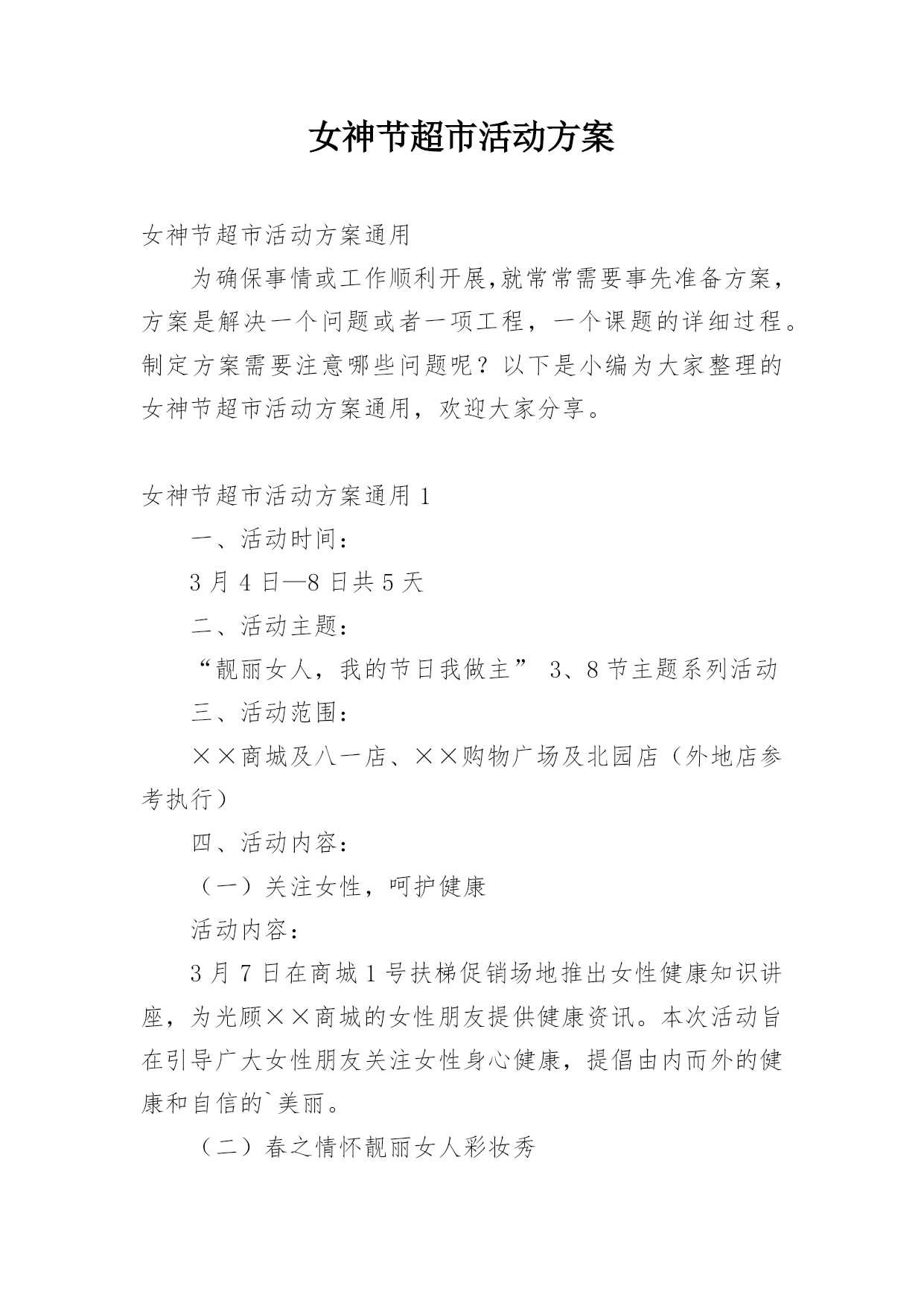 女神节超市活动方案女神节超市活动方案通用为确保事情或工作顺利开展,就常常需要事先准备方案,方案是解决一个问题或者一项工程,一个课题的详细过程。制定方案需要注意哪些问题呢?以下是小编为大家整理的女神节超市活动方案通用,欢迎大家分享。女神节超市活动方案通用1一、活动时间:3月4日—8日共5天二、活动主题:“靓丽女人,我的节日我做主”3、8节主题系列活动三、活动范围:××商城及八一店、××购物广场及北园店(外地店参考执行)四、活动内容:(一)关注女性,呵护健康活动内容:3月7日在商城1号扶梯促销场地推出女性健康
