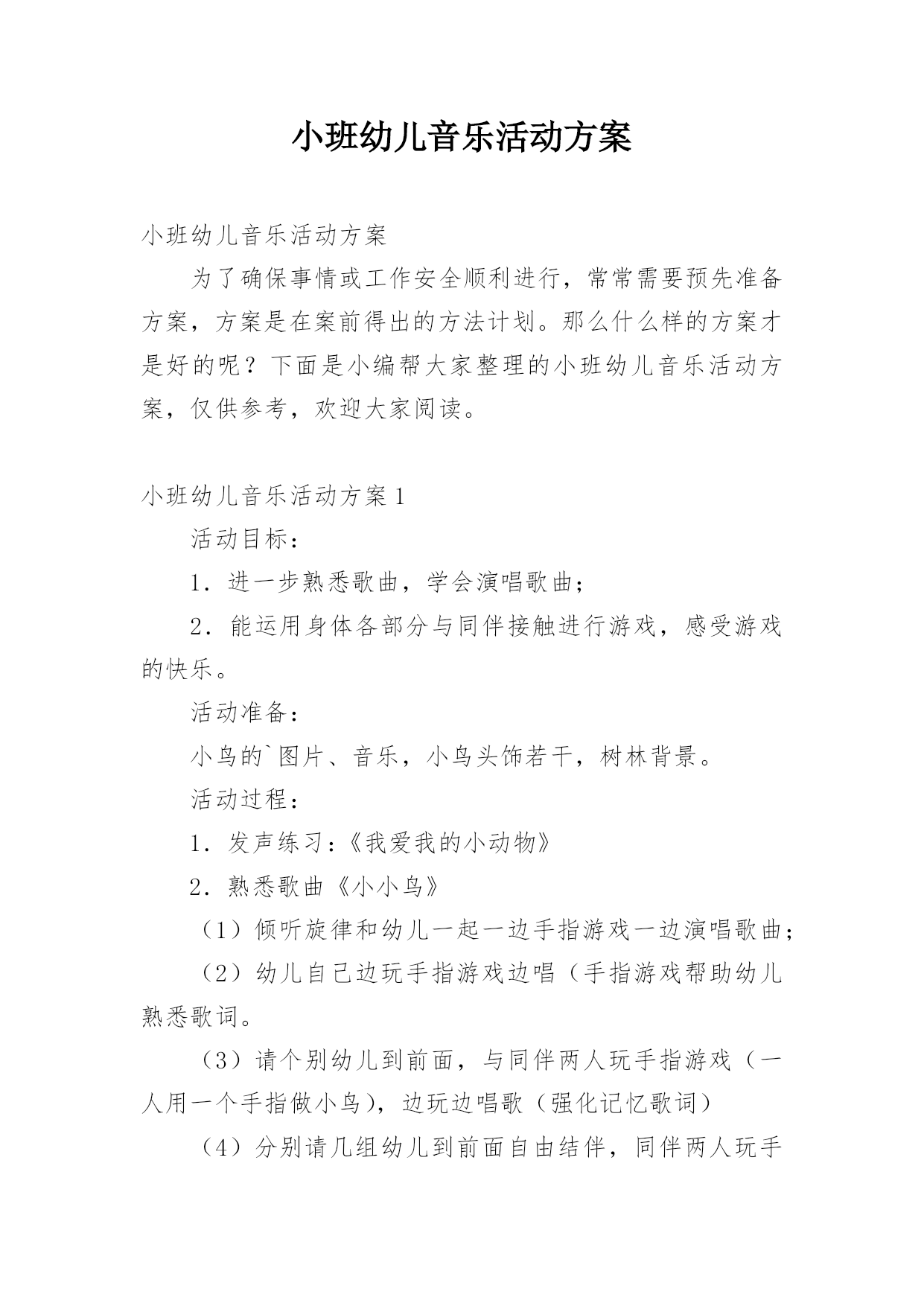 小班幼儿音乐活动方案小班幼儿音乐活动方案为了确保事情或工作安全顺利进行,常常需要预先准备方案,方案是在案前得出的方法计划。那么什么样的方案才是好的呢?下面是小编帮大家整理的小班幼儿音乐活动方案,仅供参考,欢迎大家阅读。小班幼儿音乐活动方案1活动目标:1.进一步熟悉歌曲,学会演唱歌曲;2.能运用身体各部分与同伴接触进行游戏,感受游戏的快乐。活动准备:小鸟的`图片、音乐,小鸟头饰若干,树林背景。活动过程:1.发声练习:《我爱我的小动物》2.熟悉歌曲《小小鸟》(1)倾听旋律和幼儿一起一边手指游戏一边演唱歌曲;(