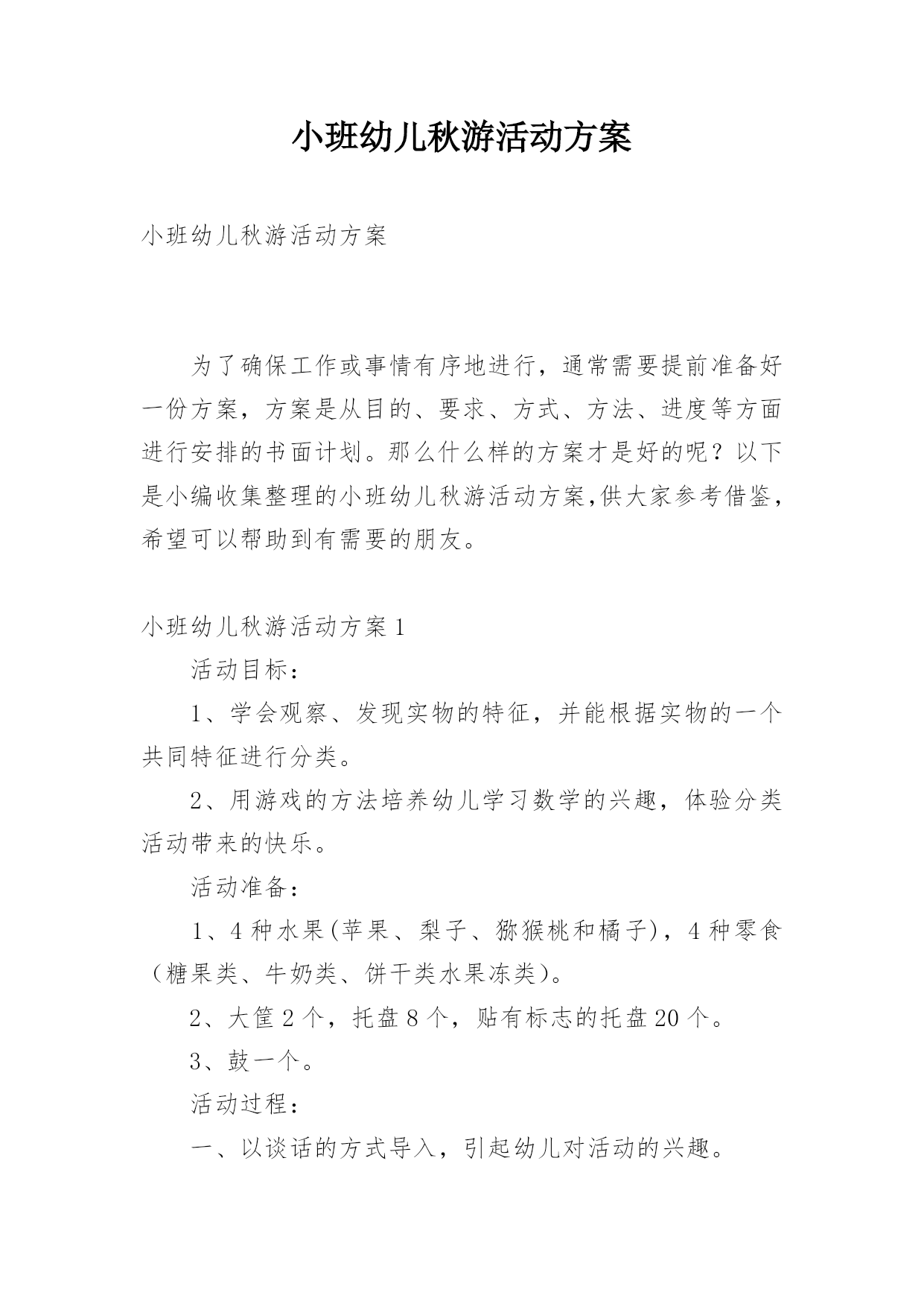 小班幼儿秋游活动方案小班幼儿秋游活动方案为了确保工作或事情有序地进行,通常需要提前准备好一份方案,方案是从目的、要求、方式、方法、进度等方面进行安排的书面计划。那么什么样的方案才是好的呢?以下是小编收集整理的小班幼儿秋游活动方案,供大家参考借鉴,希望可以帮助到有需要的朋友。小班幼儿秋游活动方案1活动目标:1、学会观察、发现实物的特征,并能根据实物的一个共同特征进行分类。2、用游戏的方法培养幼儿学习数学的兴趣,体验分类活动带来的快乐。活动准备:1、4种水果(苹果、梨子、猕猴桃和橘子),4种零食(糖果类、牛奶