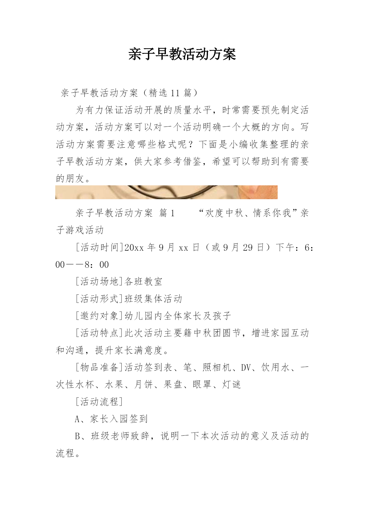亲子早教活动方案亲子早教活动方案(精选11篇)为有力保证活动开展的质量水平,时常需要预先制定活动方案,活动方案可以对一个活动明确一个大概的方向。写活动方案需要注意哪些格式呢?下面是小编收集整理的亲子早教活动方案,供大家参考借鉴,希望可以帮助到有需要的朋友。亲子早教活动方案篇1“欢度中秋、情系你我”亲子游戏活动[活动时间]20xx年9月xx日(或9月29日)下午:6:00――8:00[活动场地]各班教室[活动形式]班级集体活动[邀约对象]幼儿园内全体家长及孩子[活动特点]此次活动主要籍中秋团圆节,增进家园互