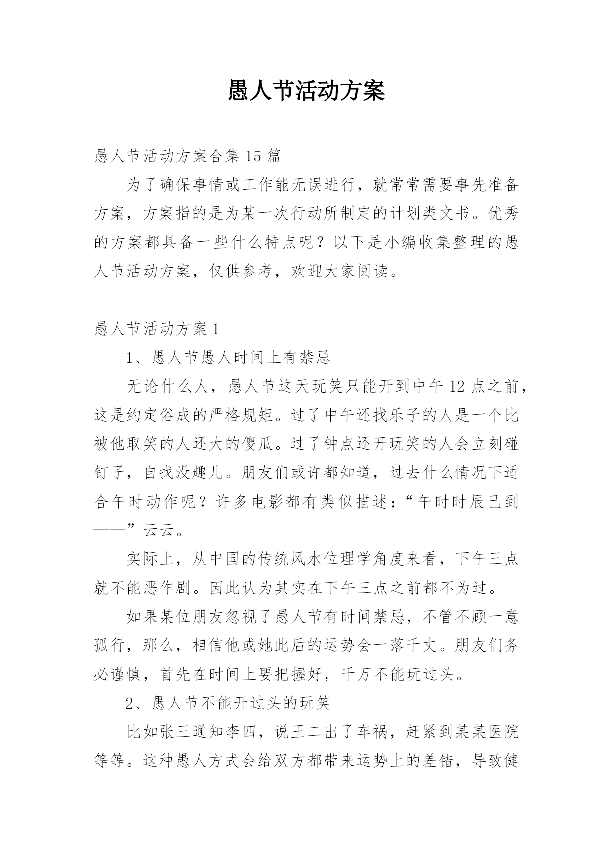 愚人节活动方案愚人节活动方案合集15篇为了确保事情或工作能无误进行,就常常需要事先准备方案,方案指的是为某一次行动所制定的计划类文书。优秀的方案都具备一些什么特点呢?以下是小编收集整理的愚人节活动方案,仅供参考,欢迎大家阅读。愚人节活动方案11、愚人节愚人时间上有禁忌无论什么人,愚人节这天玩笑只能开到中午12点之前,这是约定俗成的严格规矩。过了中午还找乐子的人是一个比被他取笑的人还大的傻瓜。过了钟点还开玩笑的人会立刻碰钉子,自找没趣儿。朋友们或许都知道,过去什么情况下适合午时动作呢?许多电影都有类似描述: