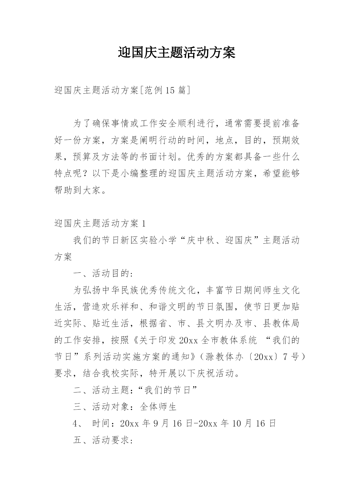 迎国庆主题活动方案迎国庆主题活动方案[范例15篇]为了确保事情或工作安全顺利进行,通常需要提前准备好一份方案,方案是阐明行动的时间,地点,目的,预期效果,预算及方法等的书面计划。优秀的方案都具备一些什么特点呢?以下是小编整理的迎国庆主题活动方案,希望能够帮助到大家。迎国庆主题活动方案1我们的节日新区实验小学“庆中秋、迎国庆”主题活动方案一、活动目的:为弘扬中华民族优秀传统文化,丰富节日期间师生文化生活,营造欢乐祥和、和谐文明的节日氛围,使节日更加贴近实际、贴近生活,根据省、市、县文明办及市、县教体局的工作