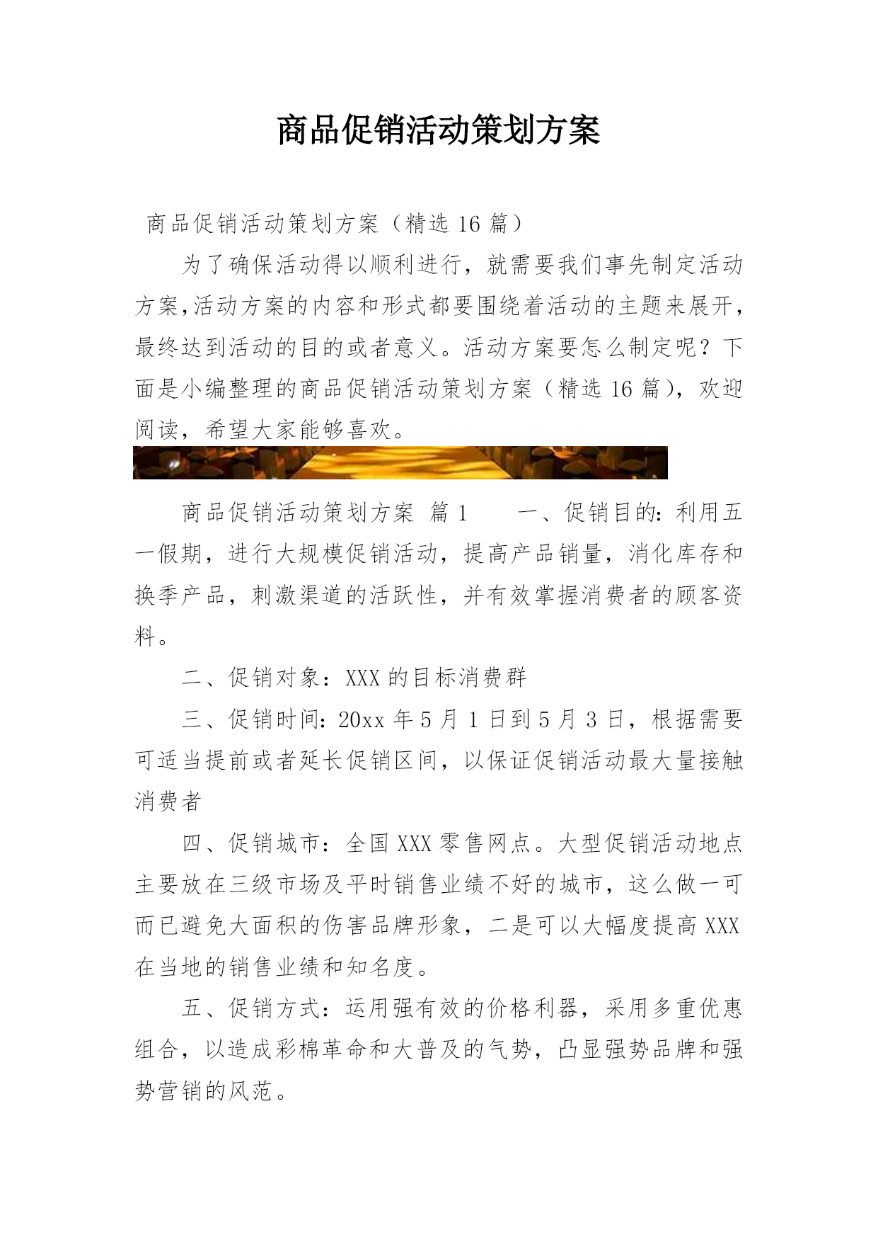 商品促销活动策划方案商品促销活动策划方案(精选16篇)为了确保活动得以顺利进行,就需要我们事先制定活动方案,活动方案的内容和形式都要围绕着活动的主题来展开,最终达到活动的目的或者意义。活动方案要怎么制定呢?下面是小编整理的商品促销活动策划方案(精选16篇),欢迎阅读,希望大家能够喜欢。商品促销活动策划方案篇1一、促销目的:利用五一假期,进行大规模促销活动,提高产品销量,消化库存和换季产品,刺激渠道的活跃性,并有效掌握消费者的顾客资料。二、促销对象:XXX的目标消费群三、促销时间:20xx年5月1日到5月3