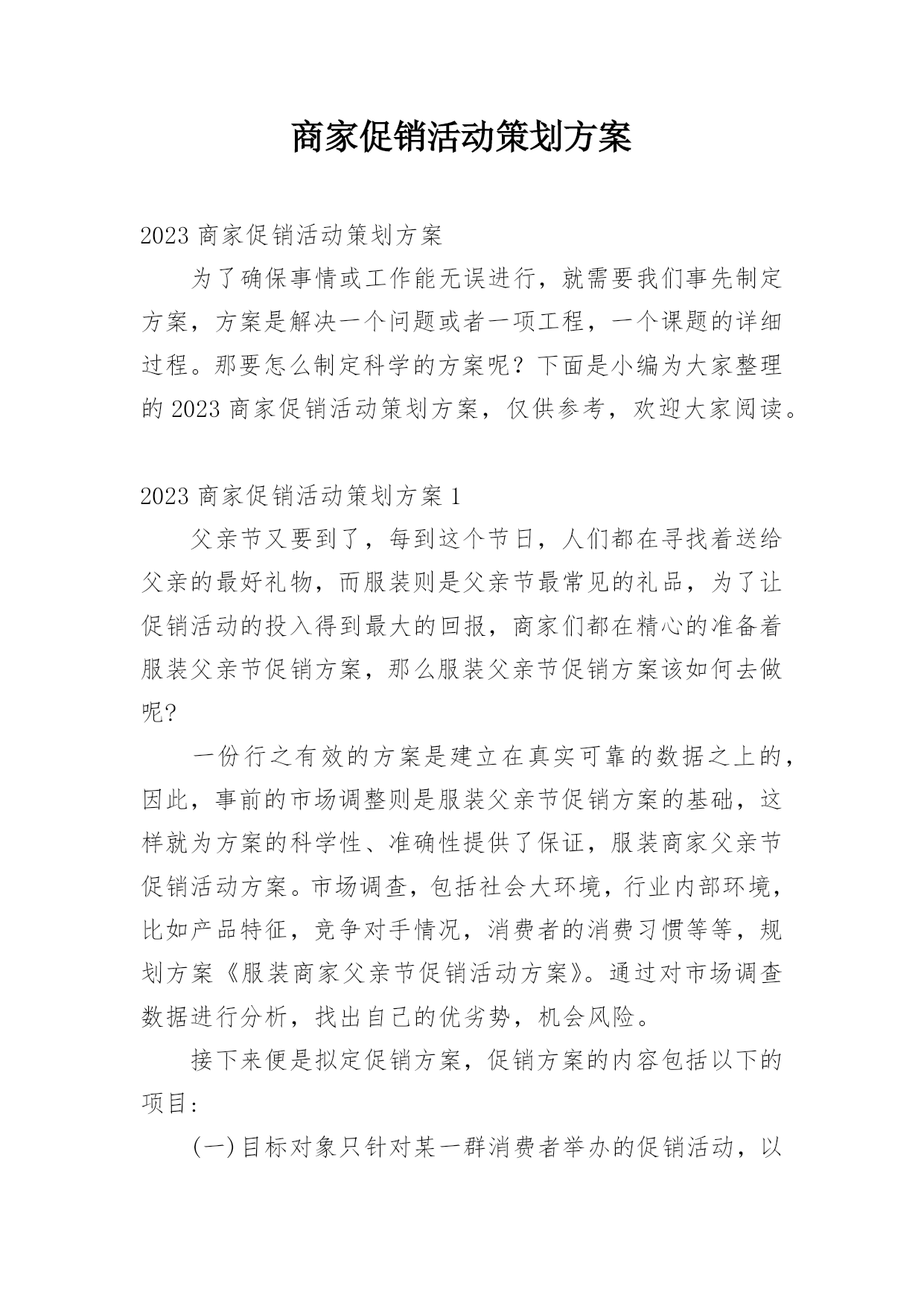 商家促销活动策划方案2023商家促销活动策划方案为了确保事情或工作能无误进行,就需要我们事先制定方案,方案是解决一个问题或者一项工程,一个课题的详细过程。那要怎么制定科学的方案呢?下面是小编为大家整理的2023商家促销活动策划方案,仅供参考,欢迎大家阅读。2023商家促销活动策划方案1父亲节又要到了,每到这个节日,人们都在寻找着送给父亲的最好礼物,而服装则是父亲节最常见的礼品,为了让促销活动的投入得到最大的回报,商家们都在精心的准备着服装父亲节促销方案,那么服装父亲节促销方案该如何去做呢?一份行之有效的方