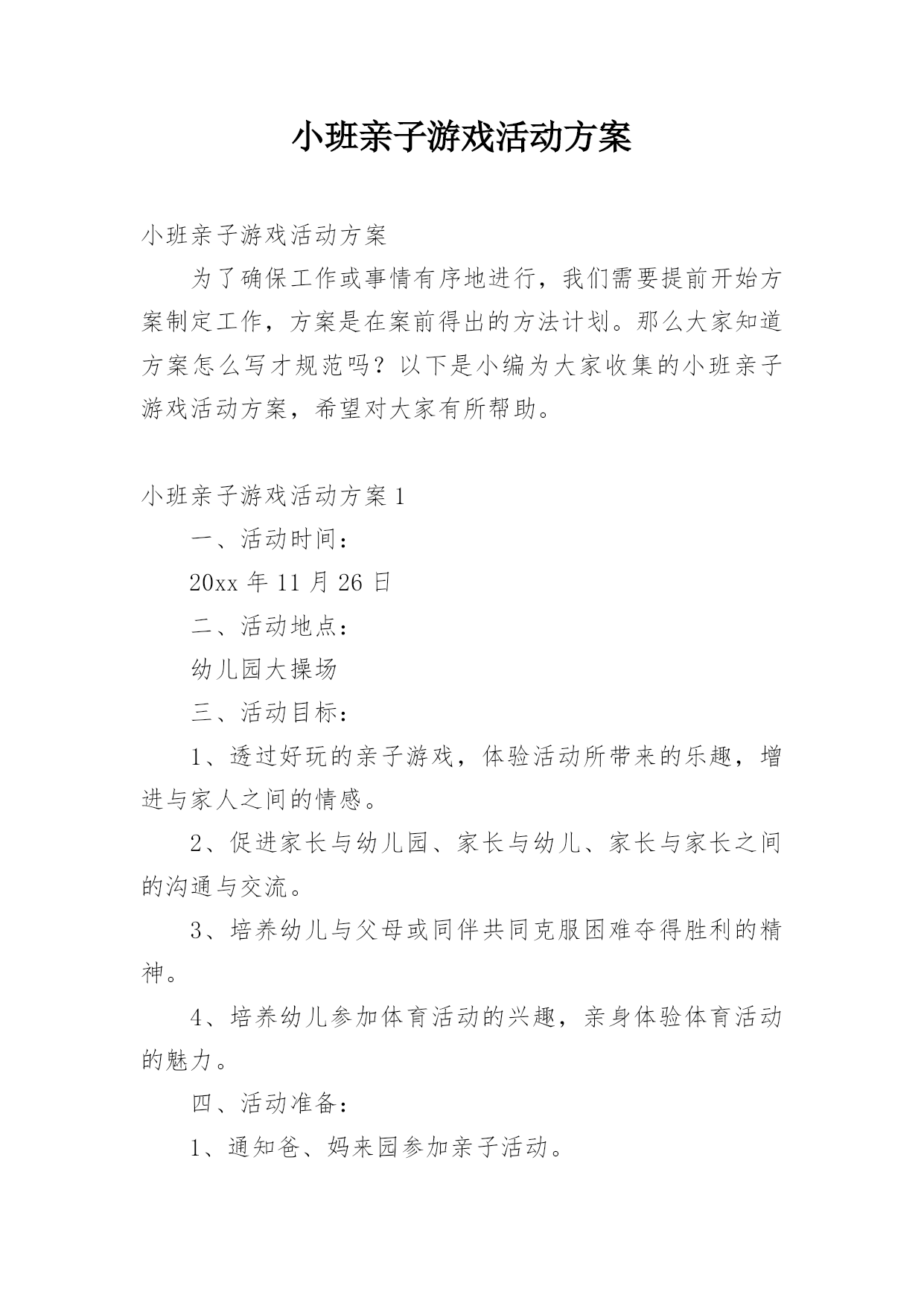 小班亲子游戏活动方案小班亲子游戏活动方案为了确保工作或事情有序地进行,我们需要提前开始方案制定工作,方案是在案前得出的方法计划。那么大家知道方案怎么写才规范吗?以下是小编为大家收集的小班亲子游戏活动方案,希望对大家有所帮助。小班亲子游戏活动方案1一、活动时间:20xx年11月26日二、活动地点:幼儿园大操场三、活动目标:1、透过好玩的亲子游戏,体验活动所带来的乐趣,增进与家人之间的情感。2、促进家长与幼儿园、家长与幼儿、家长与家长之间的沟通与交流。3、培养幼儿与父母或同伴共同克服困难夺得胜利的精神。4、培