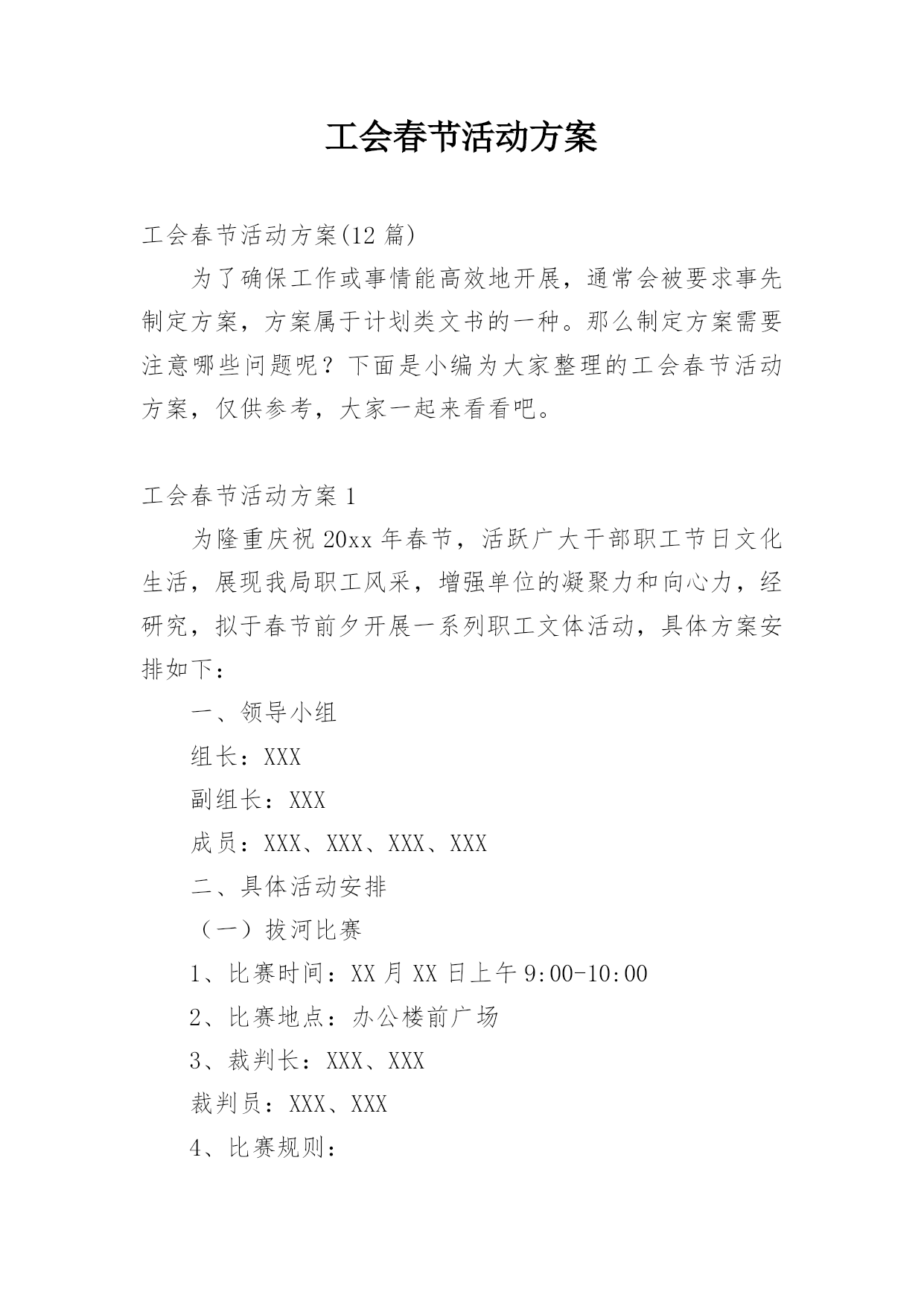 工会春节活动方案工会春节活动方案(12篇)为了确保工作或事情能高效地开展,通常会被要求事先制定方案,方案属于计划类文书的一种。那么制定方案需要注意哪些问题呢?下面是小编为大家整理的工会春节活动方案,仅供参考,大家一起来看看吧。工会春节活动方案1为隆重庆祝20xx年春节,活跃广大干部职工节日文化生活,展现我局职工风采,增强单位的凝聚力和向心力,经研究,拟于春节前夕开展一系列职工文体活动,具体方案安排如下:一、领导小组组长:XXX副组长:XXX成员:XXX、XXX、XXX、XXX二、具体活动安排(一)拔河比赛
