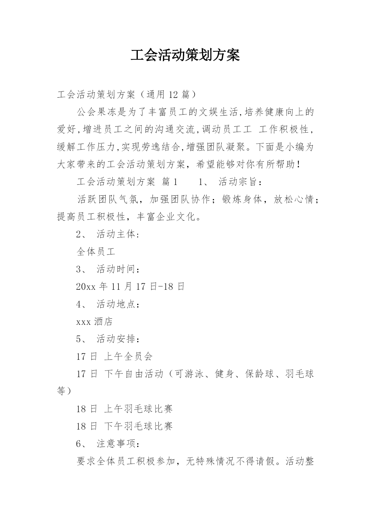 工会活动策划方案工会活动策划方案(通用12篇)公会果冻是为了丰富员工的文娱生活,培养健康向上的爱好,增进员工之间的沟通交流,调动员工工工作积极性,缓解工作压力,实现劳逸结合,增强团队凝聚。下面是小编为大家带来的工会活动策划方案,希望能够对你有所帮助!工会活动策划方案篇11、活动宗旨:活跃团队气氛,加强团队协作;锻炼身体,放松心情;提高员工积极性,丰富企业文化。2、活动主体:全体员工3、活动时间:20xx年11月17日-18日4、活动地点:xxx酒店5、活动安排:17日上午全员会17日下午自由活动(可游泳、