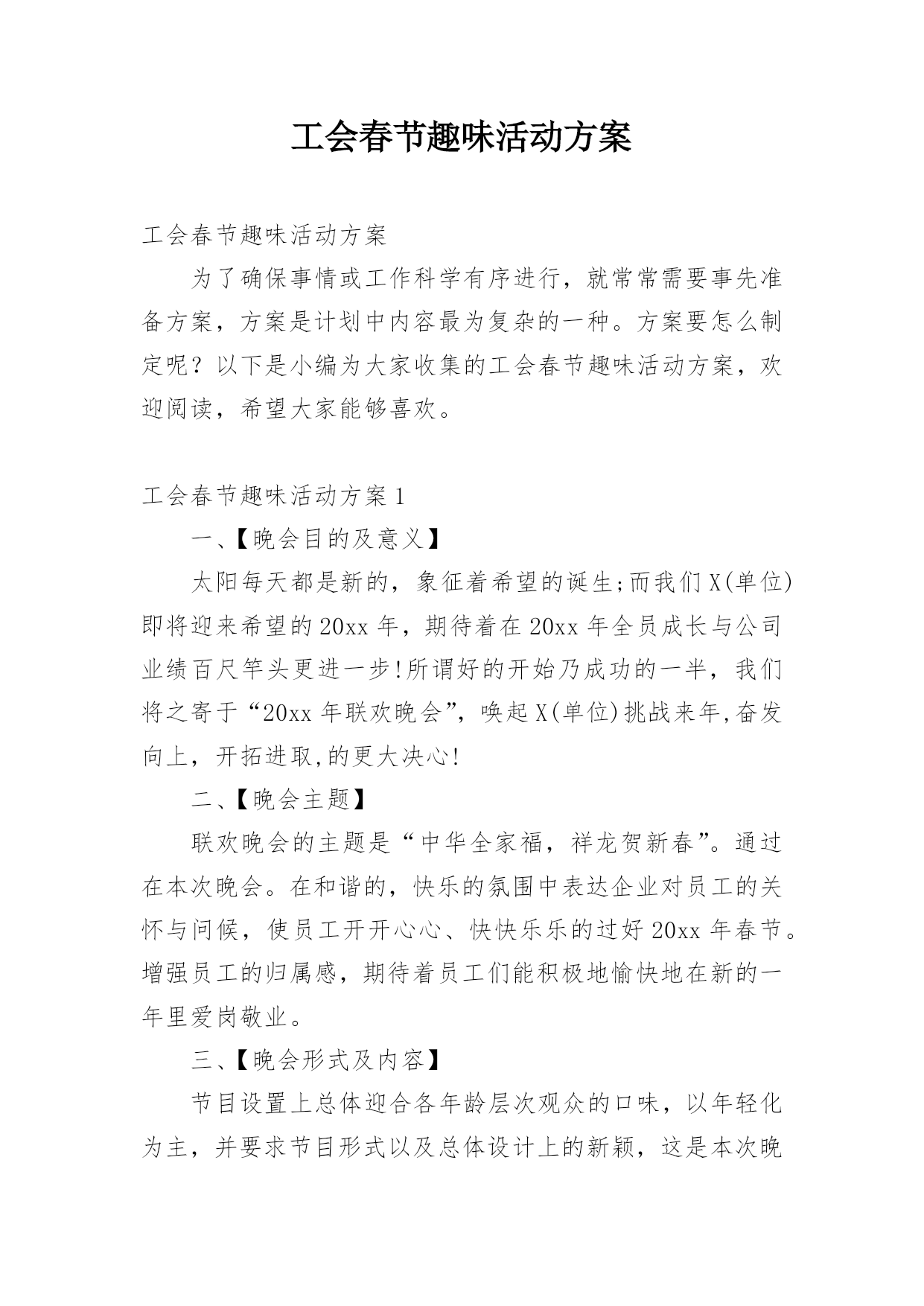 工会春节趣味活动方案工会春节趣味活动方案为了确保事情或工作科学有序进行,就常常需要事先准备方案,方案是计划中内容最为复杂的一种。方案要怎么制定呢?以下是小编为大家收集的工会春节趣味活动方案,欢迎阅读,希望大家能够喜欢。工会春节趣味活动方案1一、【晚会目的及意义】太阳每天都是新的,象征着希望的诞生;而我们X(单位)即将迎来希望的20xx年,期待着在20xx年全员成长与公司业绩百尺竿头更进一步!所谓好的开始乃成功的一半,我们将之寄于“20xx年联欢晚会”,唤起X(单位)挑战来年,奋发向上,开拓进取,的更大决心