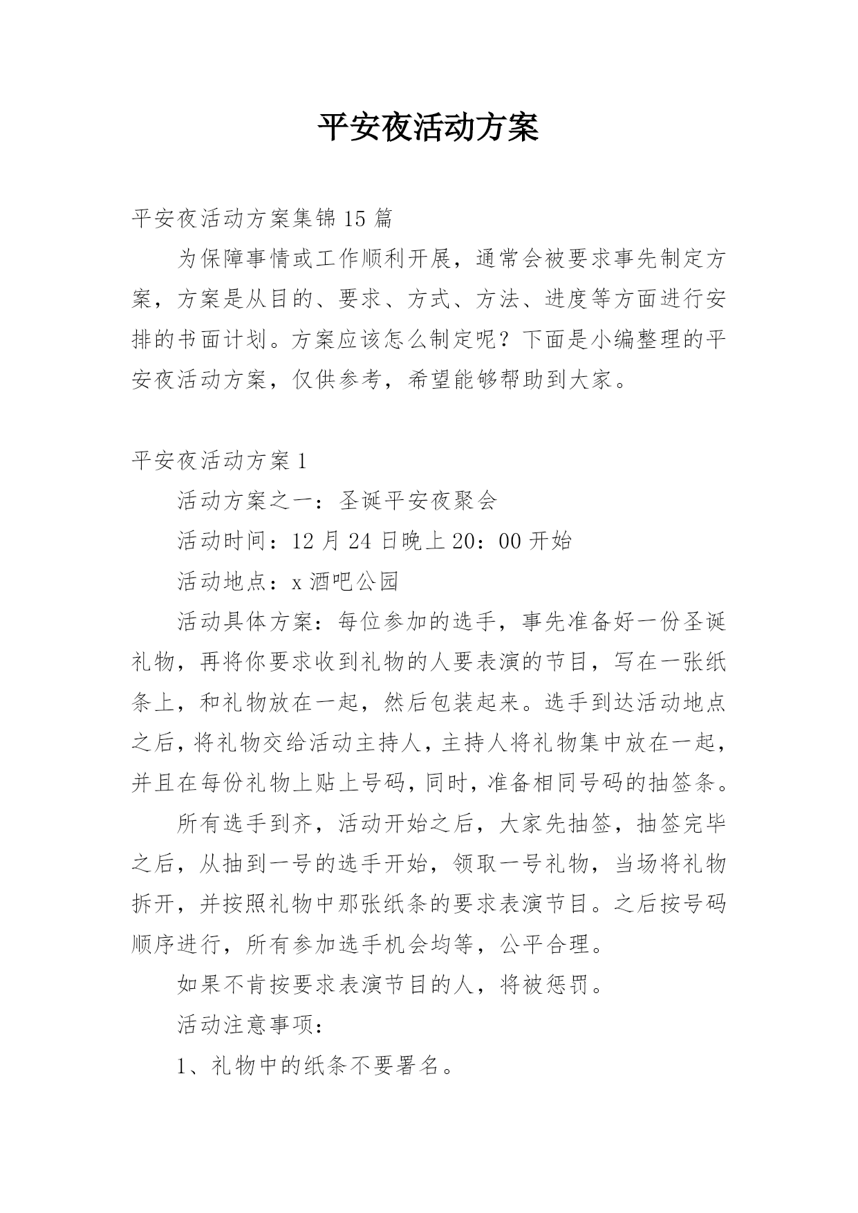 平安夜活动方案平安夜活动方案集锦15篇为保障事情或工作顺利开展,通常会被要求事先制定方案,方案是从目的、要求、方式、方法、进度等方面进行安排的书面计划。方案应该怎么制定呢?下面是小编整理的平安夜活动方案,仅供参考,希望能够帮助到大家。平安夜活动方案1活动方案之一:圣诞平安夜聚会活动时间:12月24日晚上20:00开始活动地点:x酒吧公园活动具体方案:每位参加的选手,事先准备好一份圣诞礼物,再将你要求收到礼物的人要表演的节目,写在一张纸条上,和礼物放在一起,然后包装起来。选手到达活动地点之后,将礼物交给活动