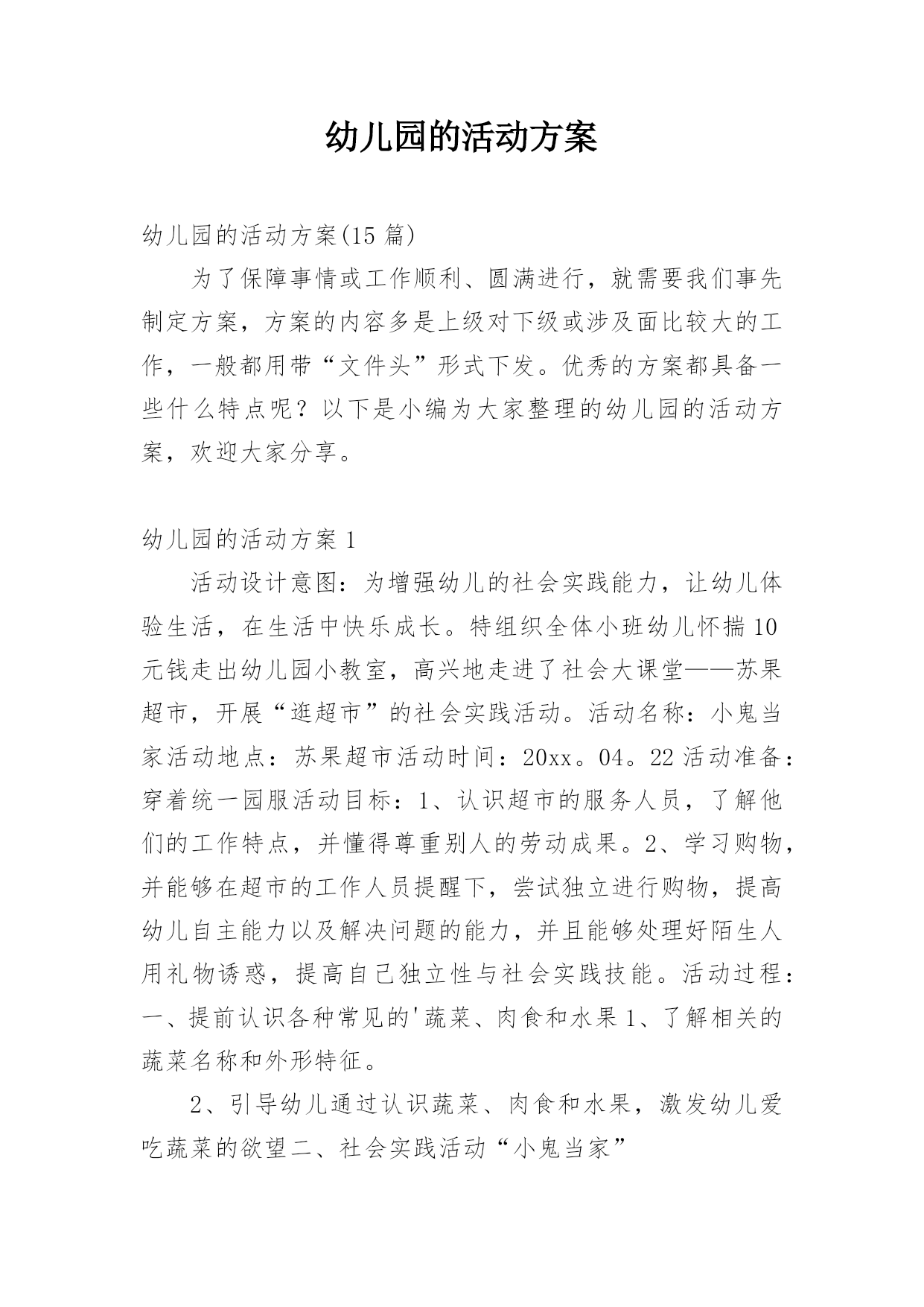 幼儿园的活动方案幼儿园的活动方案(15篇)为了保障事情或工作顺利、圆满进行,就需要我们事先制定方案,方案的内容多是上级对下级或涉及面比较大的工作,一般都用带“文件头”形式下发。优秀的方案都具备一些什么特点呢?以下是小编为大家整理的幼儿园的活动方案,欢迎大家分享。幼儿园的活动方案1活动设计意图:为增强幼儿的社会实践能力,让幼儿体验生活,在生活中快乐成长。特组织全体小班幼儿怀揣10元钱走出幼儿园小教室,高兴地走进了社会大课堂——苏果超市,开展“逛超市”的社会实践活动。活动名称:小鬼当家活动地点:苏果超市活动时