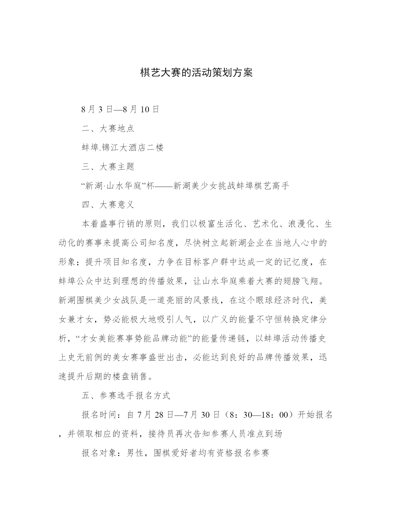 棋艺大赛的活动策划方案8月3日—8月10日二、大赛地点蚌埠.锦江大酒店二楼三、大赛主题“新湖·山水华庭”杯——新湖美少女挑战蚌埠棋艺高手四、大赛意义本着盛事行销的原则,我们以极富生活化、艺术化、浪漫化、生动化的赛事来提高公司知名度,尽快树立起新湖企业在当地人心中的形象;提升项目知名度,力争在目标客户群中达成一定的记忆度,在蚌埠公众中达到理想的传播效果,让山水华庭乘着大赛的翅膀飞翔。新湖围棋美少女战队是一道亮丽的风景线,在这个眼球经济时代,美女兼才女,势必能极大地吸引人气,以广义的能量不守恒转换定律分析,“