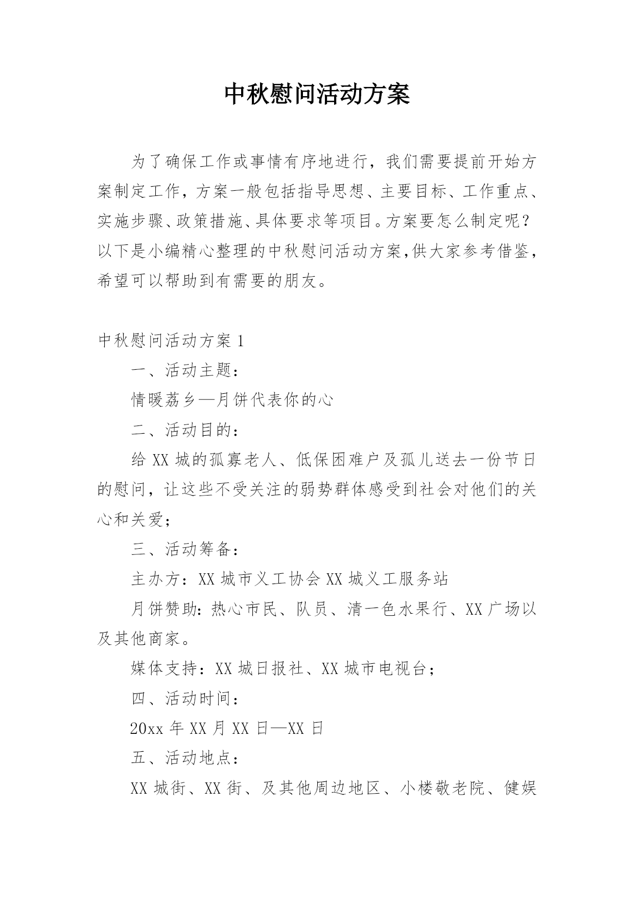 中秋慰问活动方案为了确保工作或事情有序地进行,我们需要提前开始方案制定工作,方案一般包括指导思想、主要目标、工作重点、实施步骤、政策措施、具体要求等项目。方案要怎么制定呢?以下是小编精心整理的中秋慰问活动方案,供大家参考借鉴,希望可以帮助到有需要的朋友。中秋慰问活动方案1一、活动主题:情暖荔乡—月饼代表你的心二、活动目的:给XX城的孤寡老人、低保困难户及孤儿送去一份节日的慰问,让这些不受关注的弱势群体感受到社会对他们的关心和关爱;三、活动筹备:主办方:XX城市义工协会XX城义工服务站月饼赞助:热心市民、队