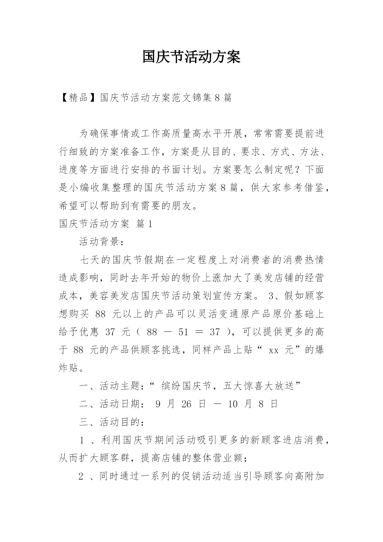 国庆节活动方案【精品】国庆节活动方案范文锦集8篇为确保事情或工作高质量高水平开展,常常需要提前进行细致的方案准备工作,方案是从目的、要求、方式、方法、进度等方面进行安排的书面计划。方案要怎么制定呢?下面是小编收集整理的国庆节活动方案8篇,供大家参考借鉴,希望可以帮助到有需要的朋友。国庆节活动方案篇1活动背景:七天的国庆节假期在一定程度上对消费者的消费热情造成影响,同时去年开始的物价上涨加大了美发店铺的经营成本,美容美发店国庆节活动策划宣传方案。3、假如顾客想购买88元以上的产品可以灵活变通原产品原价基础上