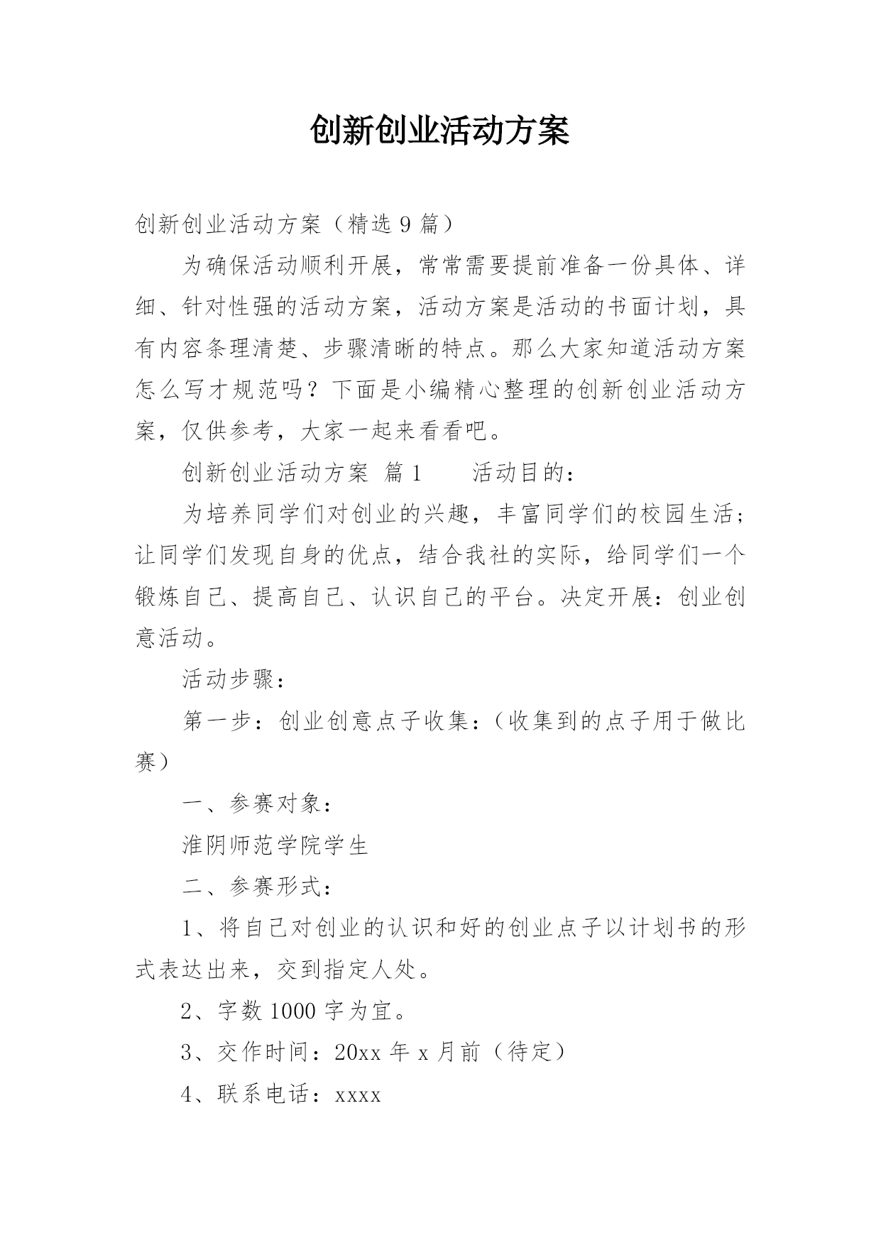 创新创业活动方案创新创业活动方案(精选9篇)为确保活动顺利开展,常常需要提前准备一份具体、详细、针对性强的活动方案,活动方案是活动的书面计划,具有内容条理清楚、步骤清晰的特点。那么大家知道活动方案怎么写才规范吗?下面是小编精心整理的创新创业活动方案,仅供参考,大家一起来看看吧。创新创业活动方案篇1活动目的:为培养同学们对创业的兴趣,丰富同学们的校园生活;让同学们发现自身的优点,结合我社的实际,给同学们一个锻炼自己、提高自己、认识自己的平台。决定开展:创业创意活动。活动步骤:第一步:创业创意点子收集:(收集