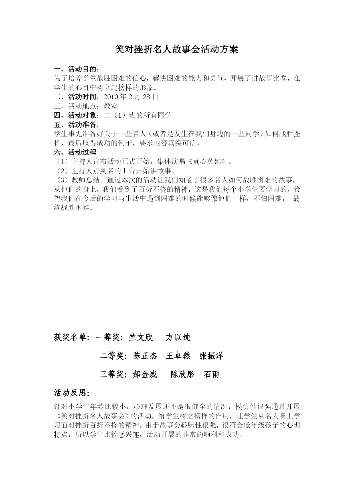 笑对挫折名人故事会活动方案一、活动目的:为了培养学生战胜困难的信心,解决困难的能力和勇气,开展了讲故事比赛,在学生的心目中树立起榜样的形象。二、活动时间:2010年2月28日三、活动地点:教室四、活动对象:二(1)班的所有同学五、活动准备:学生事先准备好关于一些名人(或者是发生在我们身边的一些同学)如何战胜挫折,最后取得成功的例子,要求内容真实可信。六、活动过程(1)主持人宣布活动正式开始,集体演唱《真心英雄》。(2)主持人点到名的上台开始讲故事。(3)教师总结。通过本次的活动让我们知道了很多名人如何战胜
