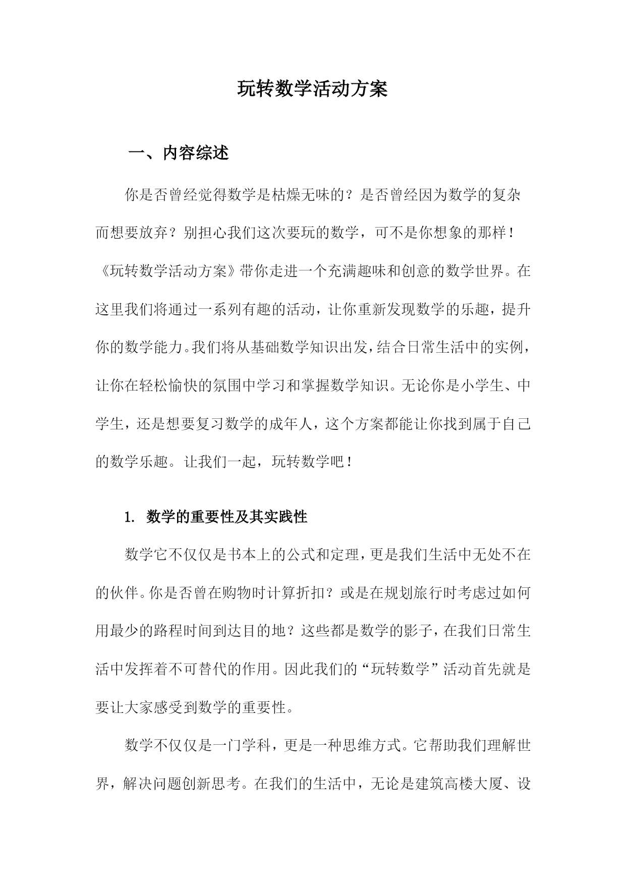 玩转数学活动方案一、内容综述你是否曾经觉得数学是枯燥无味的?是否曾经因为数学的复杂而想要放弃?别担心我们这次要玩的数学,可不是你想象的那样!《玩转数学活动方案》带你走进一个充满趣味和创意的数学世界。在这里我们将通过一系列有趣的活动,让你重新发现数学的乐趣,提升你的数学能力。我们将从基础数学知识出发,结合日常生活中的实例,让你在轻松愉快的氛围中学习和掌握数学知识。无论你是小学生、中学生,还是想要复习数学的成年人,这个方案都能让你找到属于自己的数学乐趣。让我们一起,玩转数学吧!1.数学的重要性及其实践性数学它