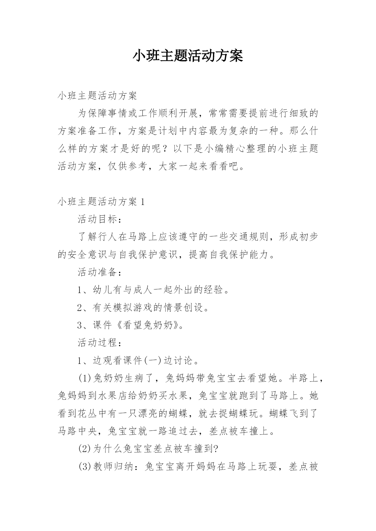 小班主题活动方案小班主题活动方案为保障事情或工作顺利开展,常常需要提前进行细致的方案准备工作,方案是计划中内容最为复杂的一种。那么什么样的方案才是好的呢?以下是小编精心整理的小班主题活动方案,仅供参考,大家一起来看看吧。小班主题活动方案1活动目标:了解行人在马路上应该遵守的一些交通规则,形成初步的安全意识与自我保护意识,提高自我保护能力。活动准备:1、幼儿有与成人一起外出的经验。2、有关模拟游戏的情景创设。3、课件《看望兔奶奶》。活动过程:1、边观看课件(一)边讨论。(1)兔奶奶生病了,兔妈妈带兔宝宝去看